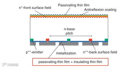 图34 使用钝化和绝缘薄膜的具有去耦发射器/BSF和栅格几何形状的交错式背结太阳能电池[227]。