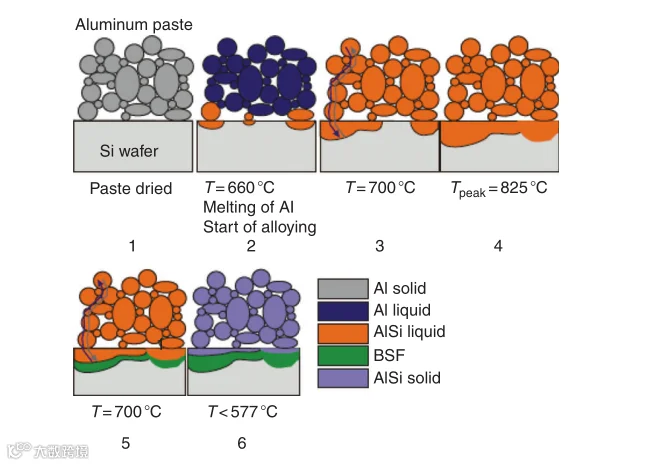 图11从丝网印刷的铝浆中形成铝的后表面场和后接触。(1)干燥后的浆料;(2)在660℃时,铝发生熔化,硅溶解在混合相中;(3)在700℃左右,所有的铝完全熔化,硅大量加入;(4)在峰值温度下,液相具有最大厚度;(5)在冷却过程中,硅随着铝的加入而重结晶,而混合液相中的硅含量减少,(6)在共晶温度下,铝和硅的混合相凝固。经许可转载自HusterF (2005)研究丝网印刷铝浆在硅太阳能电池上形成BSF的合金化过程。在。第20届欧洲光伏太阳能会议论文集,第1466-1469页。西班牙,巴塞罗那[42]。Copyright2005 WIP, Munich.