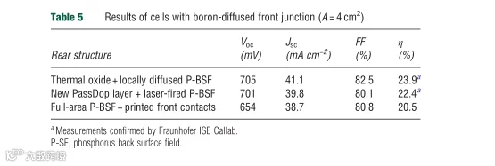 尽管这种电池仍然没有选择性发射器,这就有了进一步改进的余地,但最近在校准的孔径区域(照明区域包括母线)测量中,效率达到了23.9%[222](见表5)。