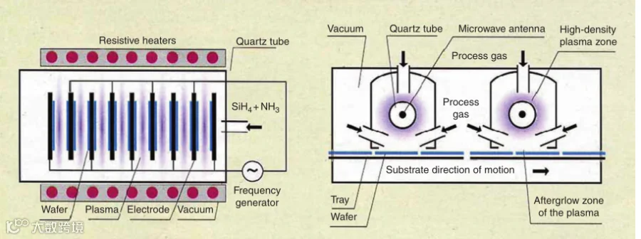 图8 两个主要的等离子体增强化学气相沉积(PECVD)技术的示意图。(左)直接低频等离子体和(右)微波天线。经许可转载自Photon International,2003年3月[39]。Copyright 2003 Photon Holding GmbH.