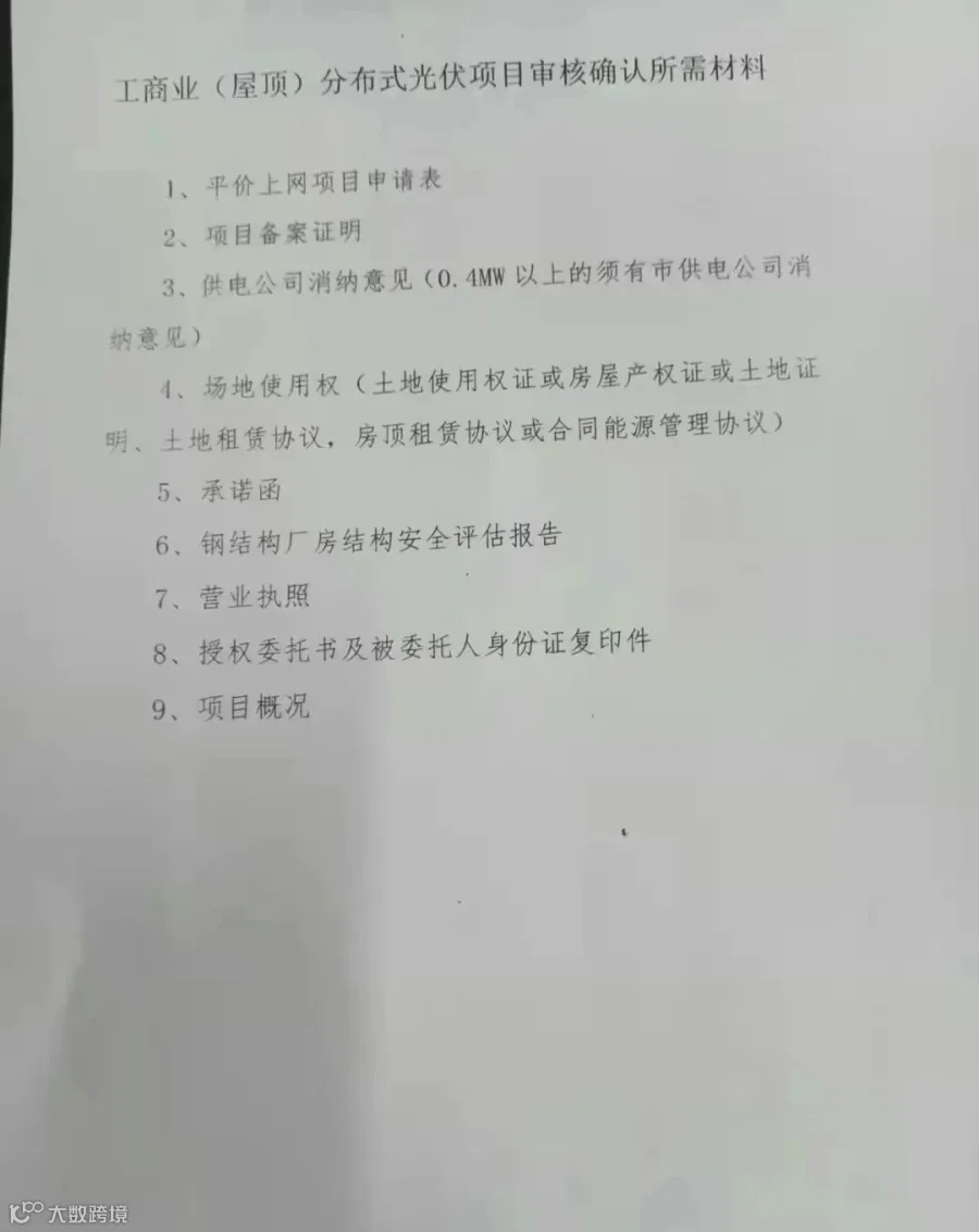 光伏系统建设完成后,需要向供电公司提供项目审核所需材料(部分地区可能有所不同),如下图所示。
