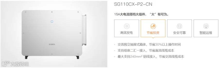 根据组件的电气参数,最大功率点的工作电流约12A。可选择市面上主流逆变器—阳光SG110CX-P2-CN逆变器,此款逆变器最大直流输入15A,能够全面适配当下大功率组件,同时支持1.4及以上超配,节约初始投资。