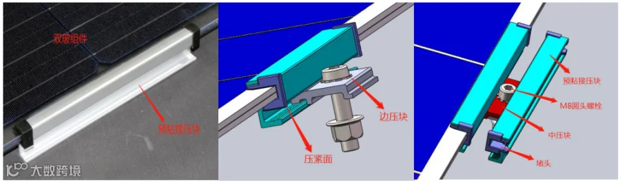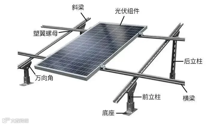 组件: 组件的铝合金边框与支架进行连接,再通过引线完成可靠接地。