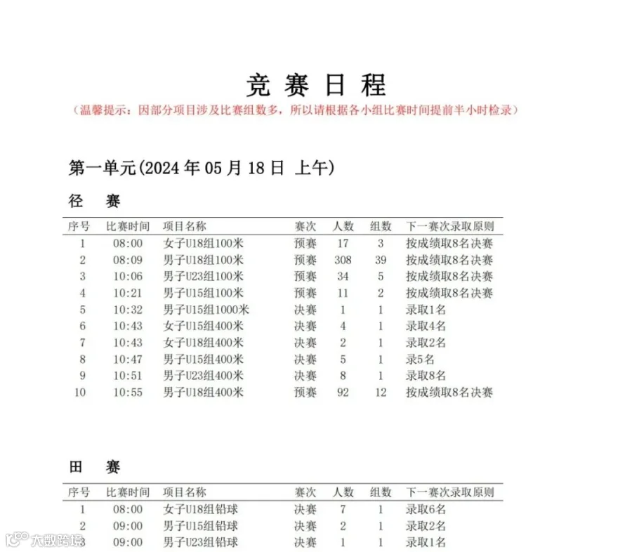 1. 田赛项目:于比赛时间提前30分钟检录;