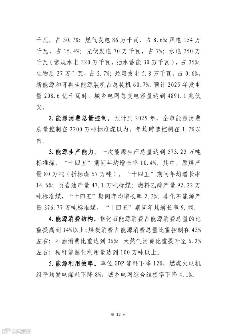 到2025年底,全市建成投产的发电总装机容量规模达到1000万千瓦左右。其中:风电154万千瓦;光伏发电70万千瓦;水电350万千瓦(常规水电320万千瓦,抽水蓄能30万千瓦)
