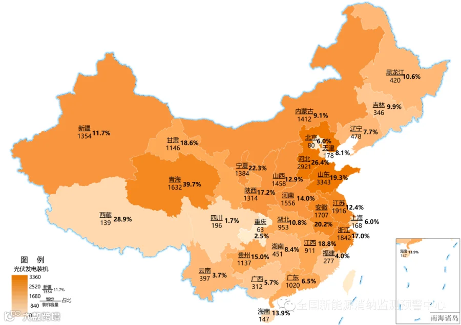 2021年,光伏发电3259亿千瓦时,同比增长25.1%;各省光伏发电量情况及在各省电力供应中占比如下图所示。