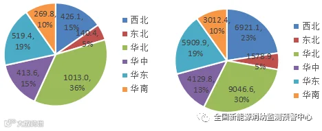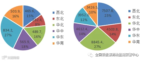 四季度各区域新增(左)、累计(右)并网光伏发电装机(万千瓦)