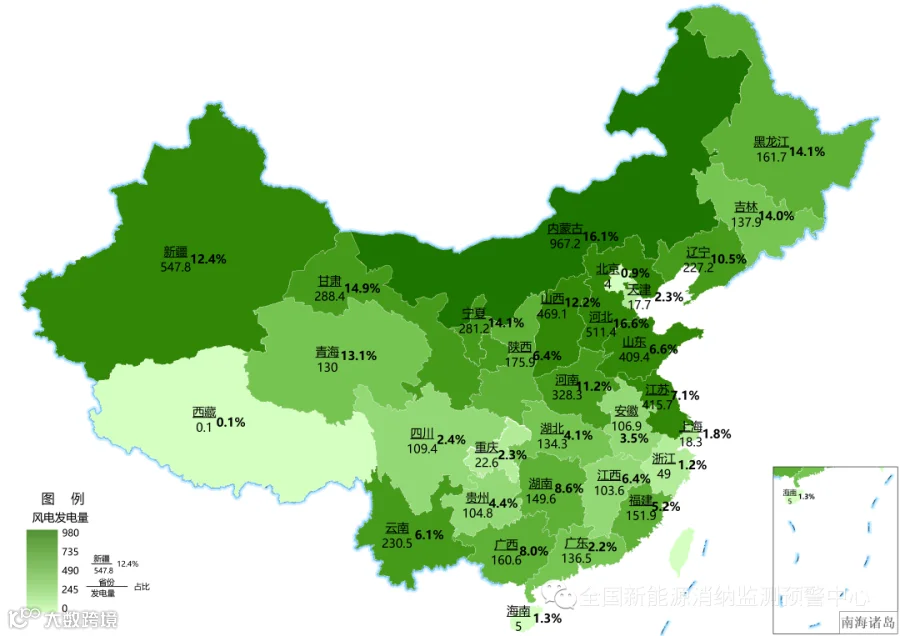 各地区2021年累计风电发电量(亿千瓦时)及占本地区总发电量比重