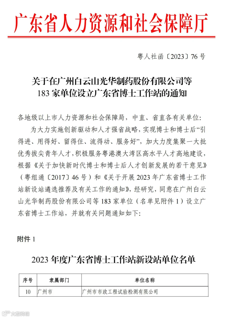 3月7日,广东省人力资源和社会保障厅发布《关于在广州白云山光华制药股份有限公司等183家单位设立广东省博士工作站的通知》(粤人社函〔2023〕76号),广州市市政工程试验检测有限公司(以下简称“市政检测公司”)成功获批设立广东省博士工作站。