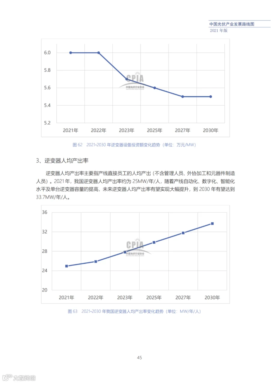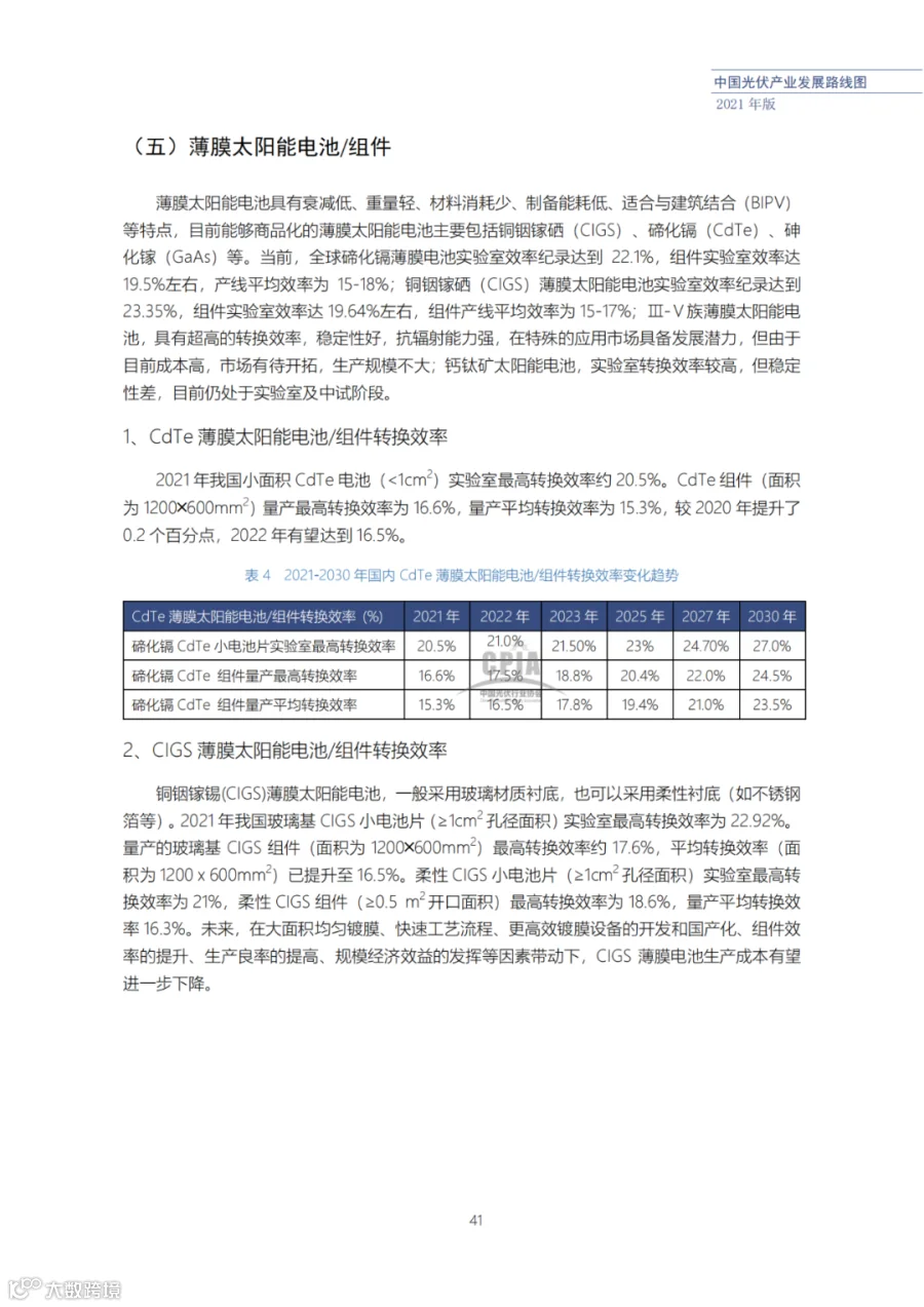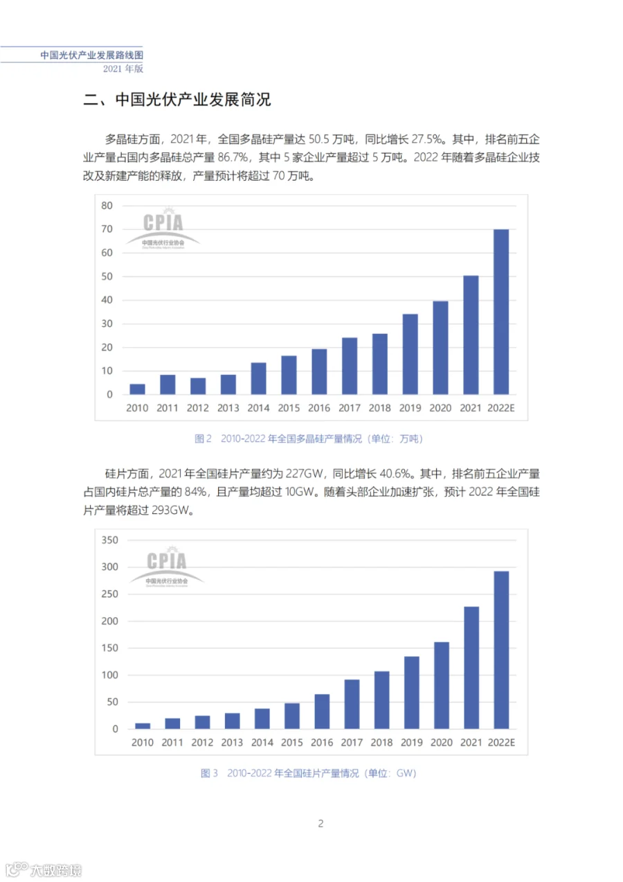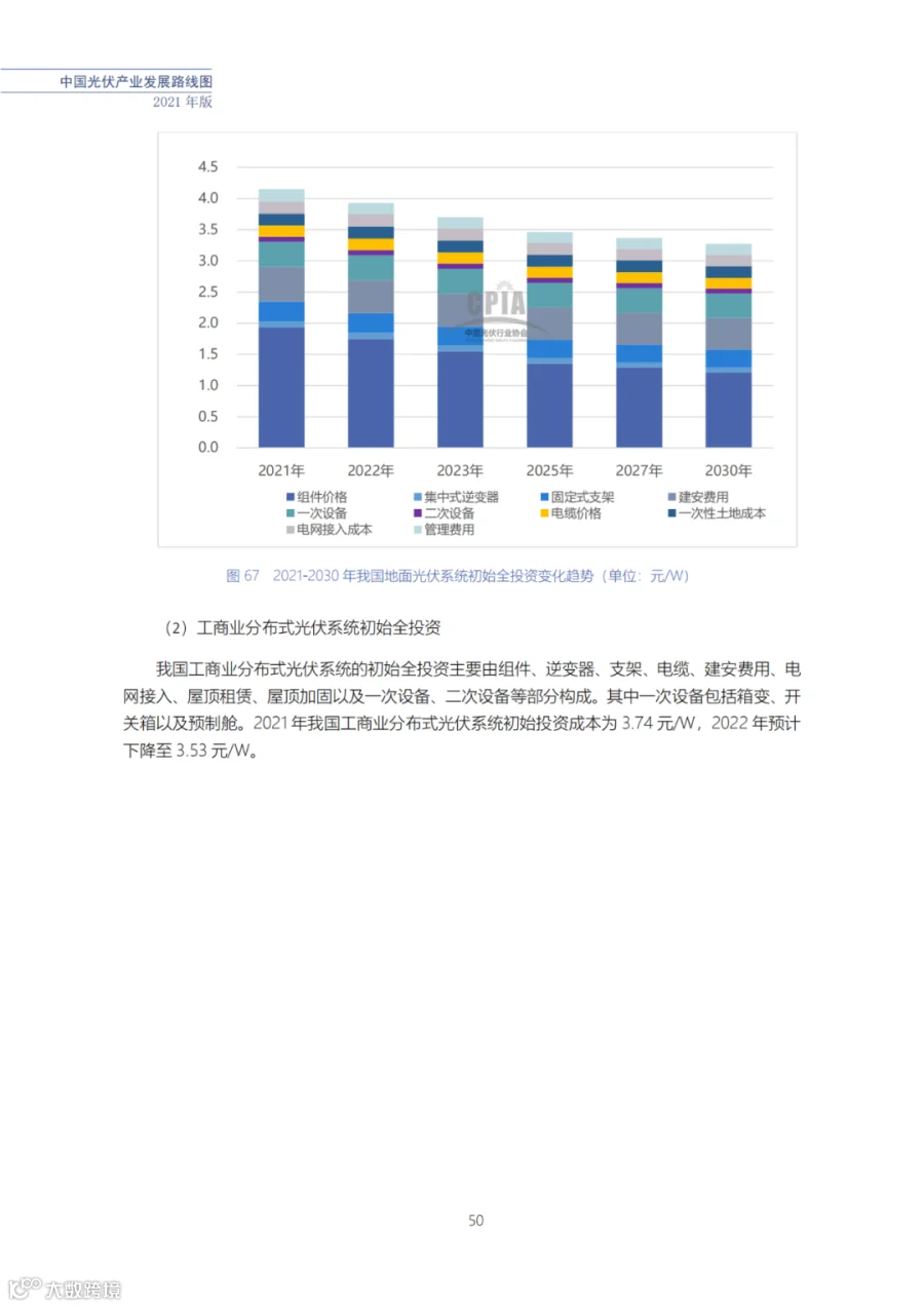近日了解到,中国光伏行业协会发布了《中国光伏产业发展路线图(2021年版)》,内容涵盖了光伏产业链上下游各环节,包括多晶硅、硅棒/硅锭/硅片、电池、组件、逆变器、系统等各环节共67个关键指标。