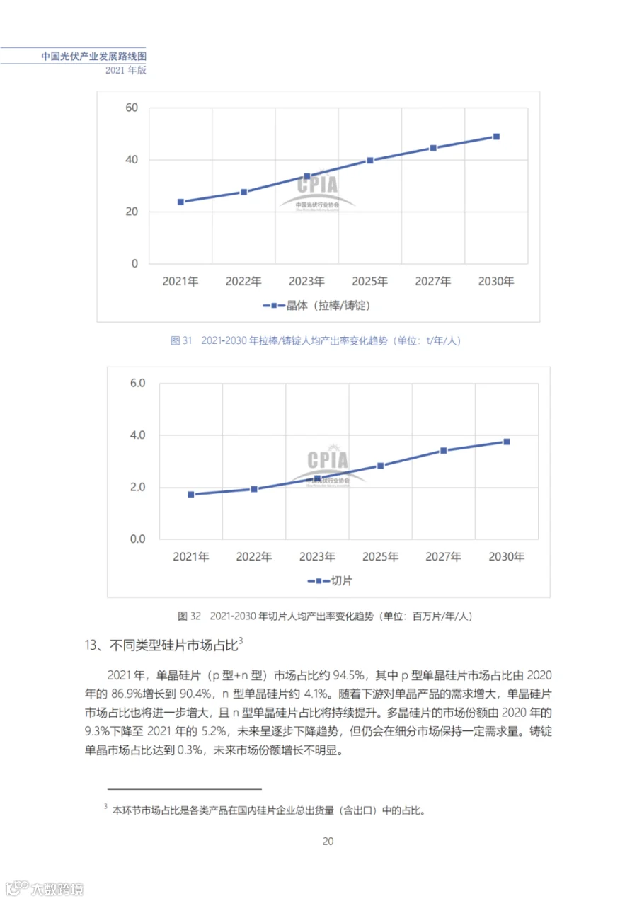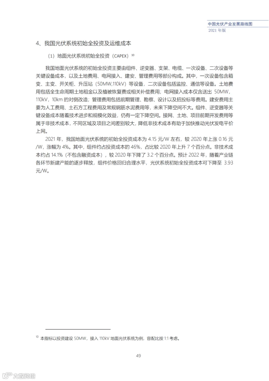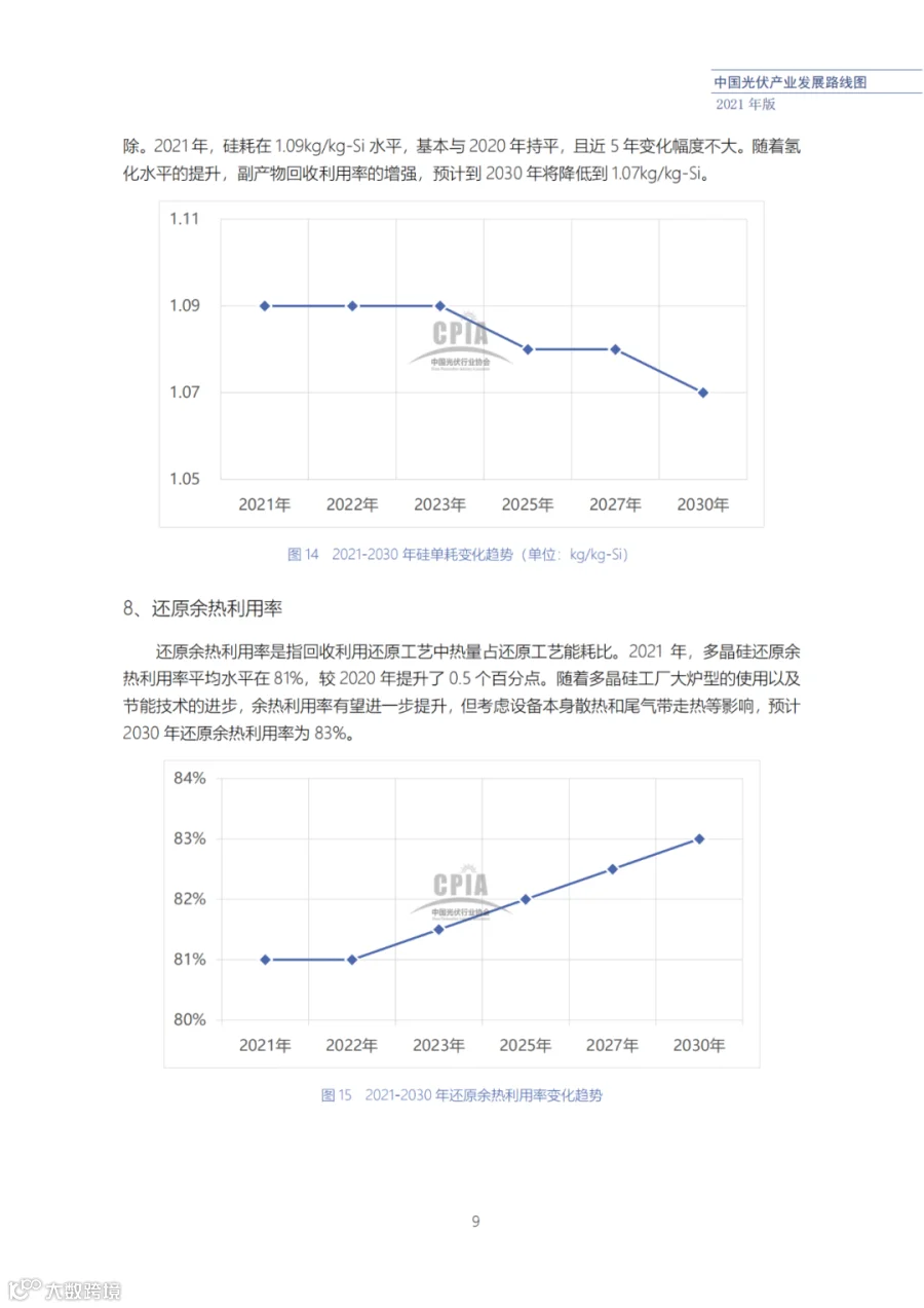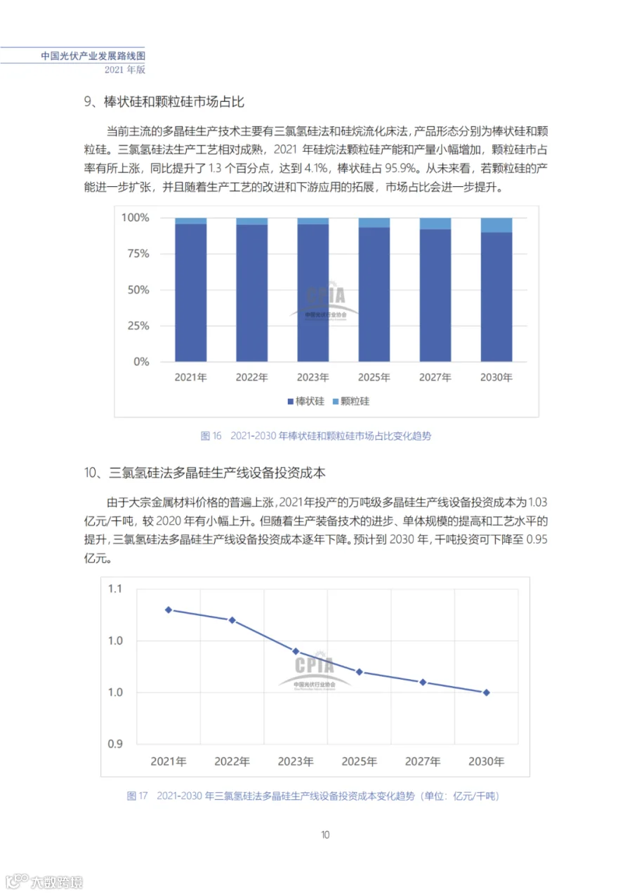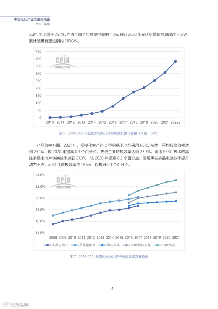 近日了解到,中国光伏行业协会发布了《中国光伏产业发展路线图(2021年版)》,内容涵盖了光伏产业链上下游各环节,包括多晶硅、硅棒/硅锭/硅片、电池、组件、逆变器、系统等各环节共67个关键指标。