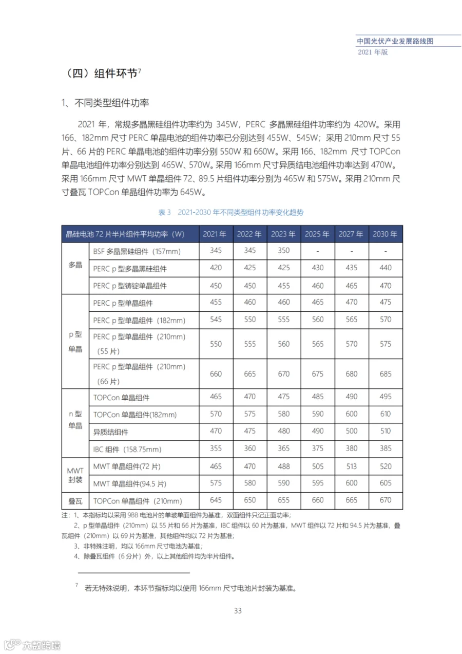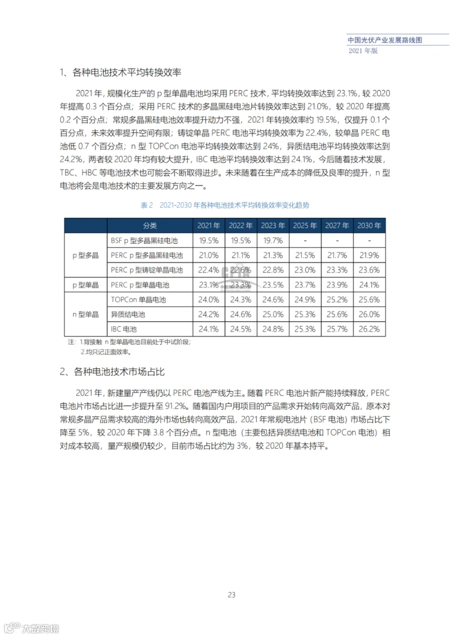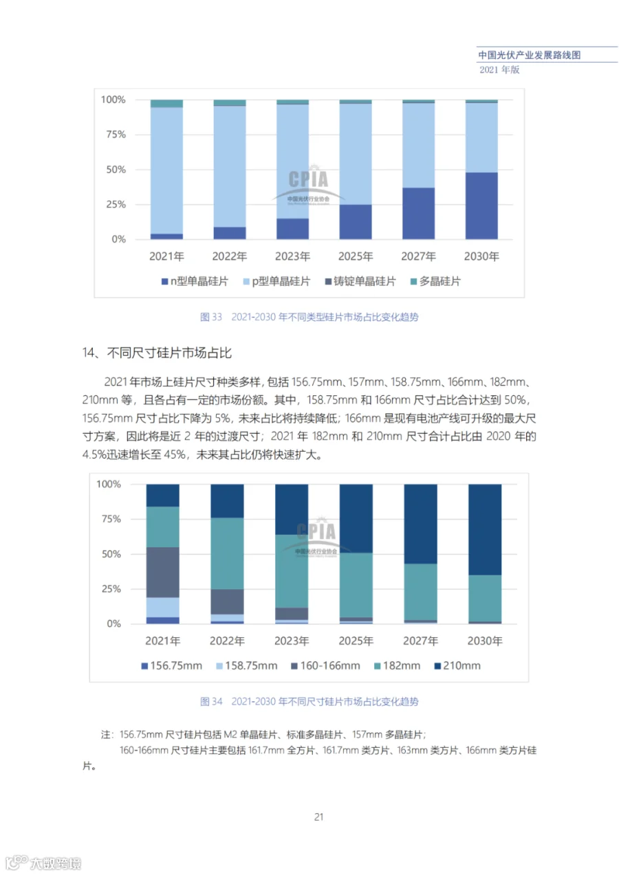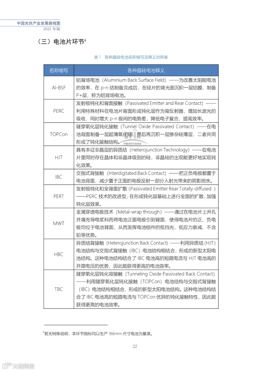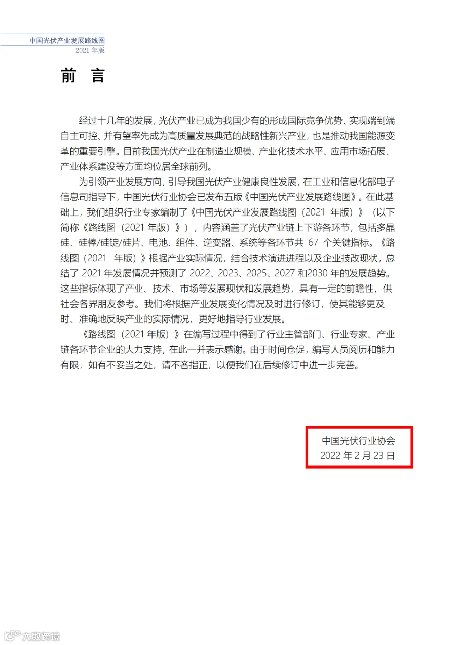 该路线图根据产业实际情况,结合技术演进进程以及企业技改现状,总结了2021年发展情况并预测了2022、2023、2025、2027和2030年的发展趋势。这些指标体现了光伏产业、技术、市场等发展现状和发展趋势,具有一定的前瞻性,供社会各界朋友参考。