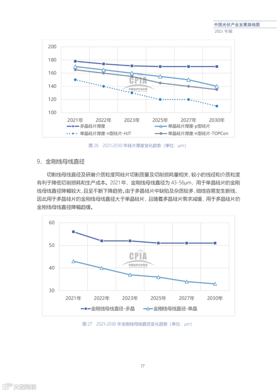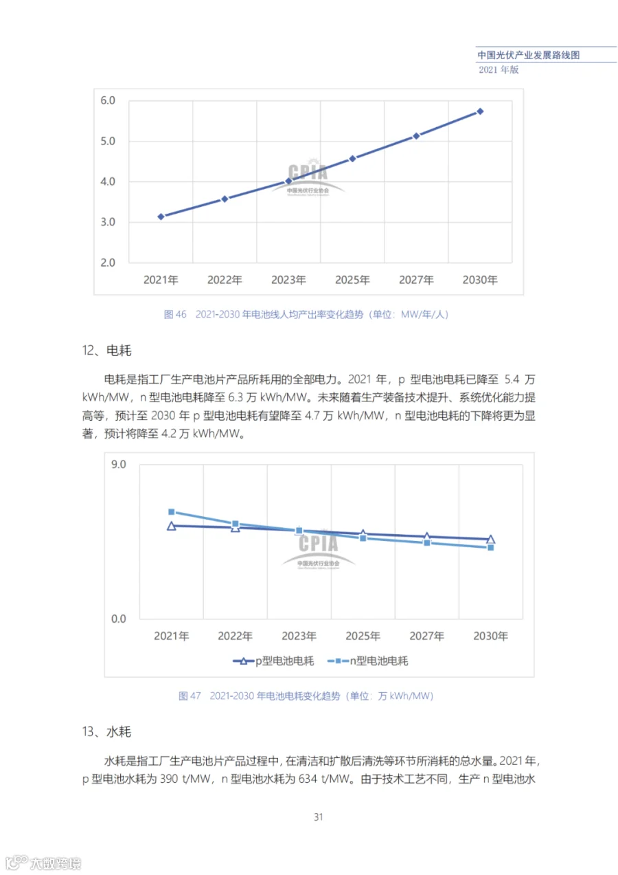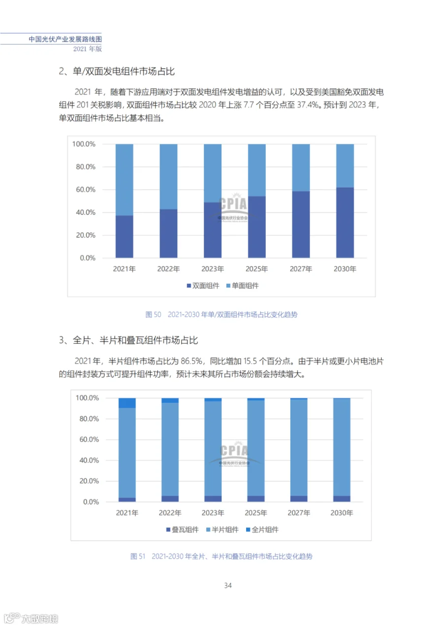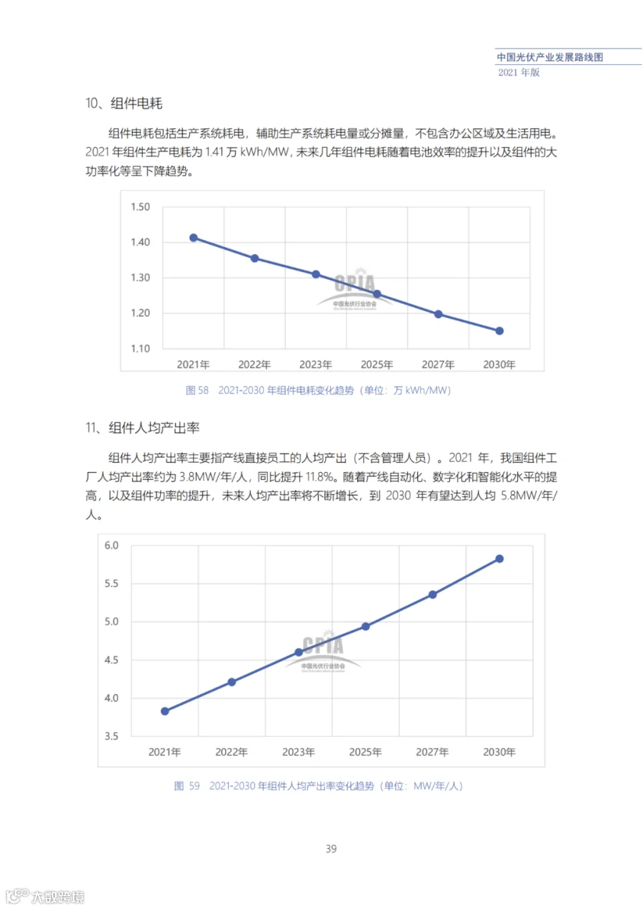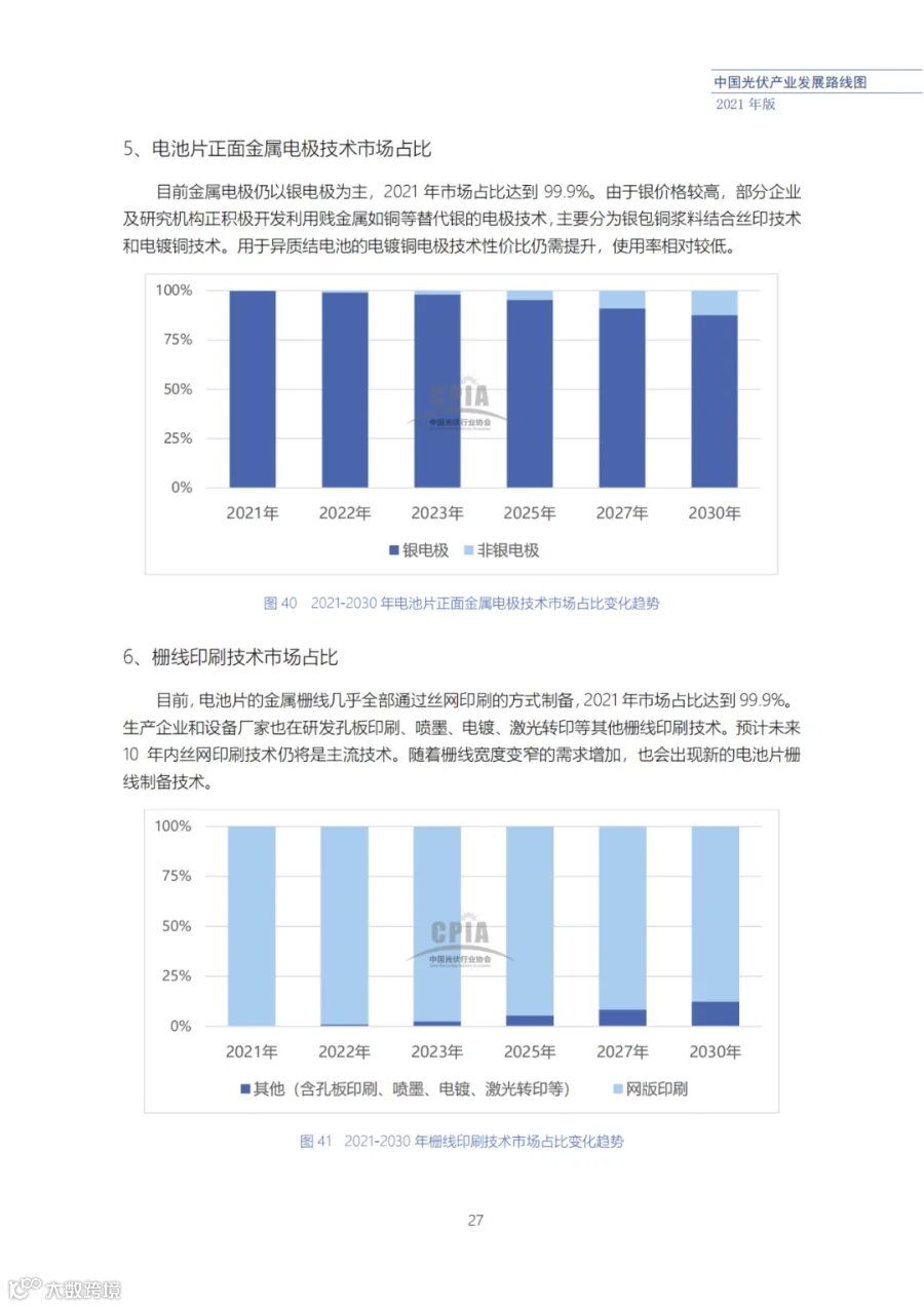 该路线图根据产业实际情况,结合技术演进进程以及企业技改现状,总结了2021年发展情况并预测了2022、2023、2025、2027和2030年的发展趋势。这些指标体现了光伏产业、技术、市场等发展现状和发展趋势,具有一定的前瞻性,供社会各界朋友参考。