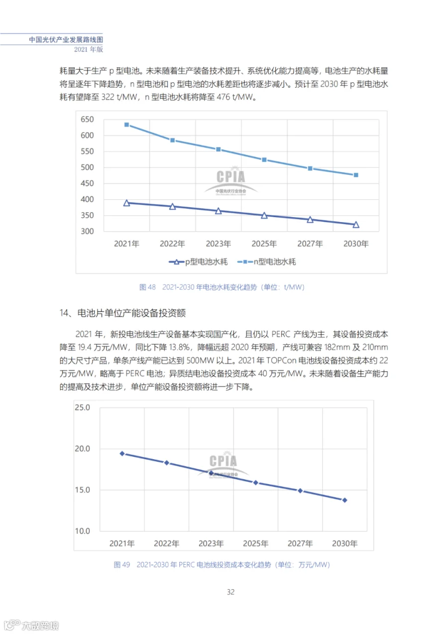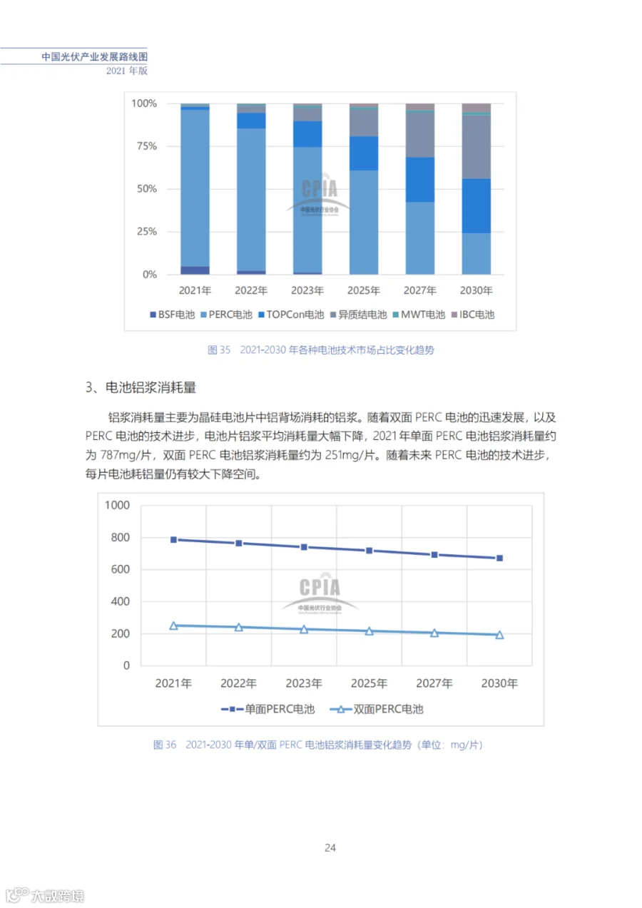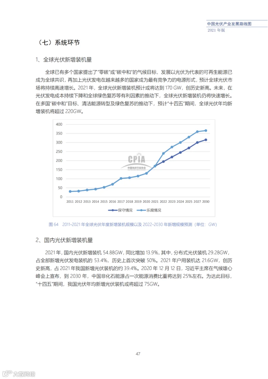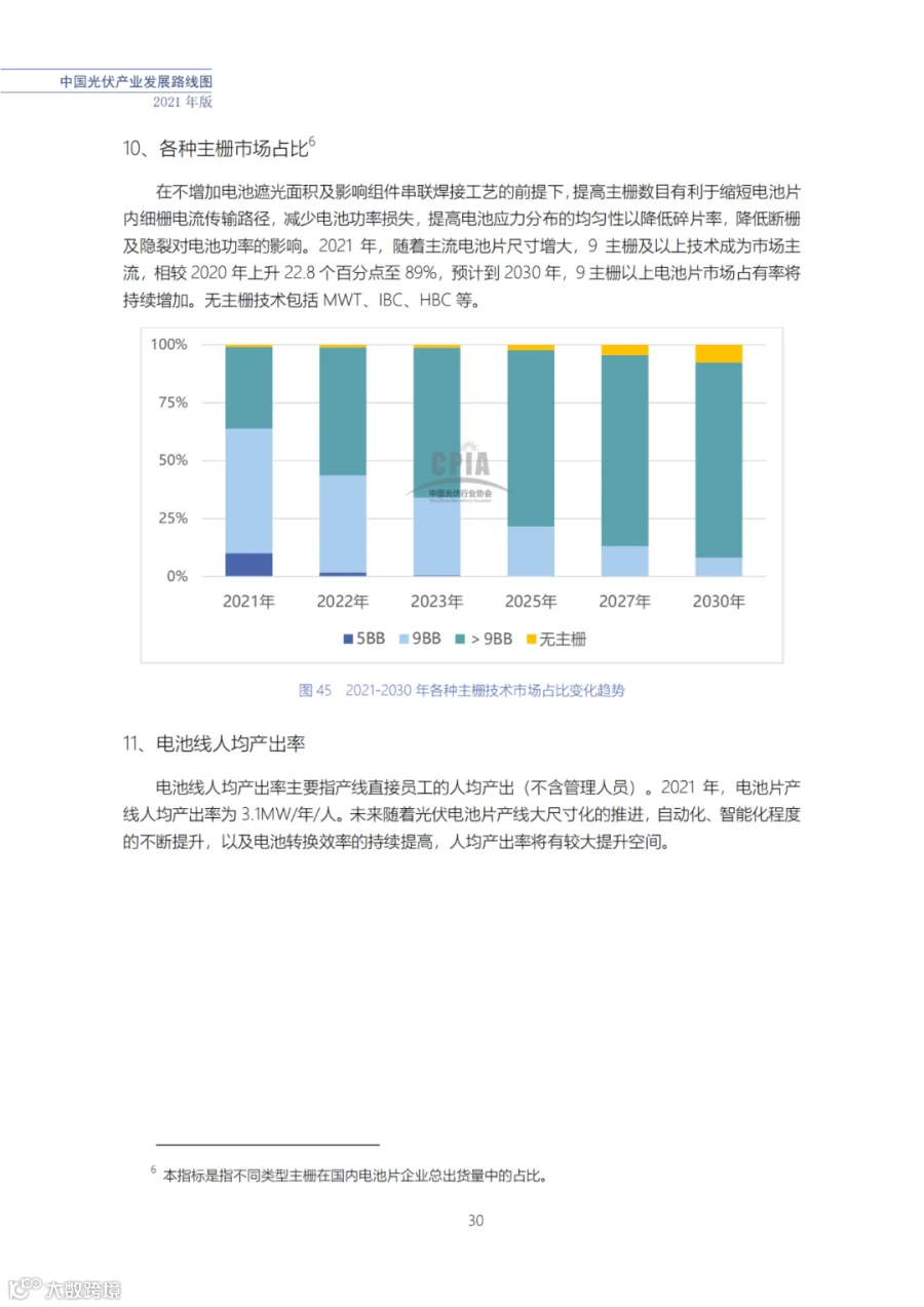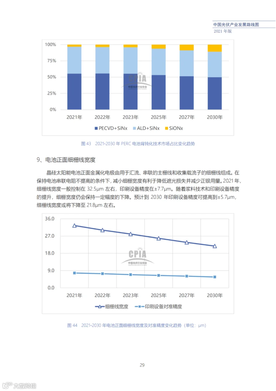 该路线图根据产业实际情况,结合技术演进进程以及企业技改现状,总结了2021年发展情况并预测了2022、2023、2025、2027和2030年的发展趋势。这些指标体现了光伏产业、技术、市场等发展现状和发展趋势,具有一定的前瞻性,供社会各界朋友参考。