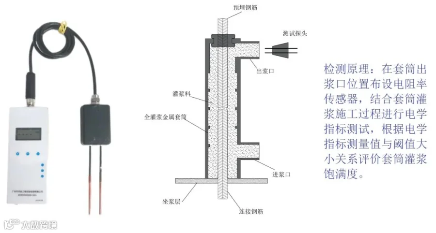 为了突破预埋阻尼传感器法、钢丝拉拔法和X射线法等现有套筒灌浆质量检测方法的局限性,市政检测公司经过近三年时间的研发创新,提出了基于电学原理的装配式结构套筒灌浆饱满度检测核心技术,开发了装配式结构套筒灌浆饱满度电学测试设备。该套筒灌浆饱满度检测设备属国际首创,该项技术通过套筒出浆口电学参数指标变化来判断套筒灌浆饱满度,具有检测结果及时准确、现场操作高效的技术优势,且检测成本较低,仅为同类技术的1/20,能实现套筒灌浆快速、全数检测。