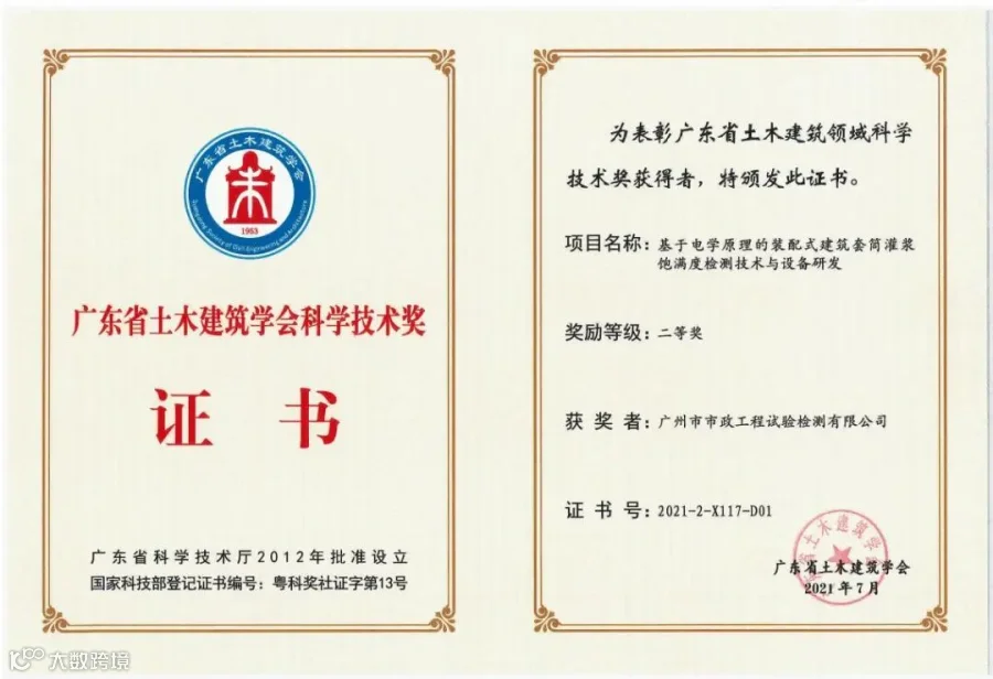 本项核心技术已申请7项国家专利,其中发明专利3项,国际PCT专利1项,已获得授权实用新型专利3项,相关技术研究成果现已纳入广东省《装配式建筑混凝土结构耐久性技术标准》,并荣获广东省土木建筑学会科学技术二等奖。该项目研究成果已通过了以我国著名桥梁专家、广东省首届勘察设计大师宁平华教授级高工为主任的鉴定委员会鉴定,鉴定结论为“研究成果总体上达到了国际领先水平”。同时本项技术得到了广东省市场监督管理局检验检测相关领域专家的认可,成功入选能力参数库,现已通过广东省市场监督管理局检验检测能力认证,纳入CMA检测资质参数。