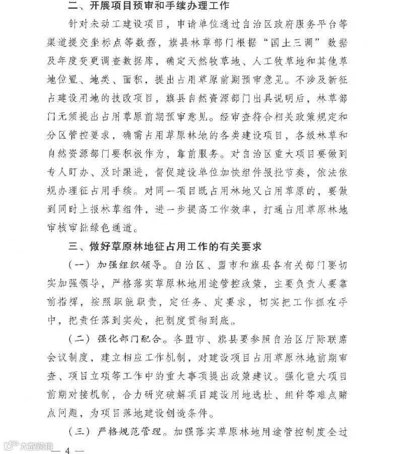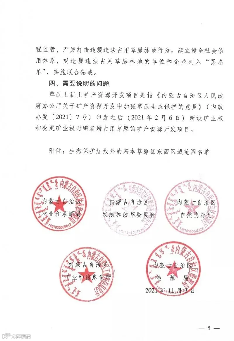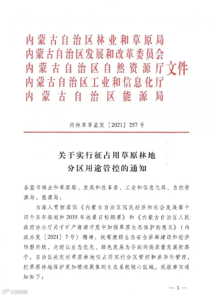近日,内蒙古自治区林业和草原局,内蒙古自治区发展和改革委员会,内蒙古自治区自然资源厅,内蒙古自治区工业和信息化厅,内蒙古自治区能源局联合发布《关于实行征占用草原林地分区用途管控的通知》。