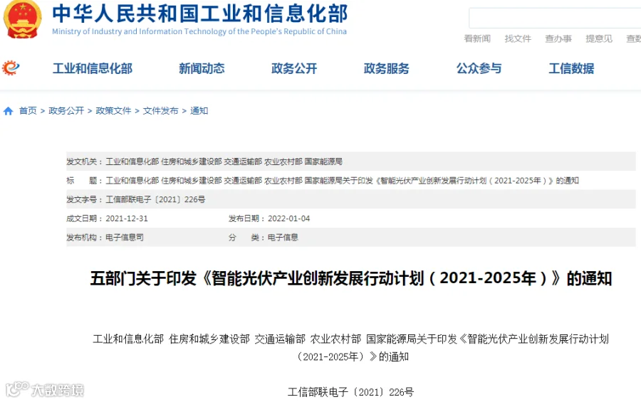 2022年1月5日,国家能源局、交通运输部、工业和信息化部、住房和城乡建设部、农业农村部五部门联合印发《智能光伏产业创新发展行动计划(2021-2025年)》的通知,明确逐步扩大绿色交通应用规模。
