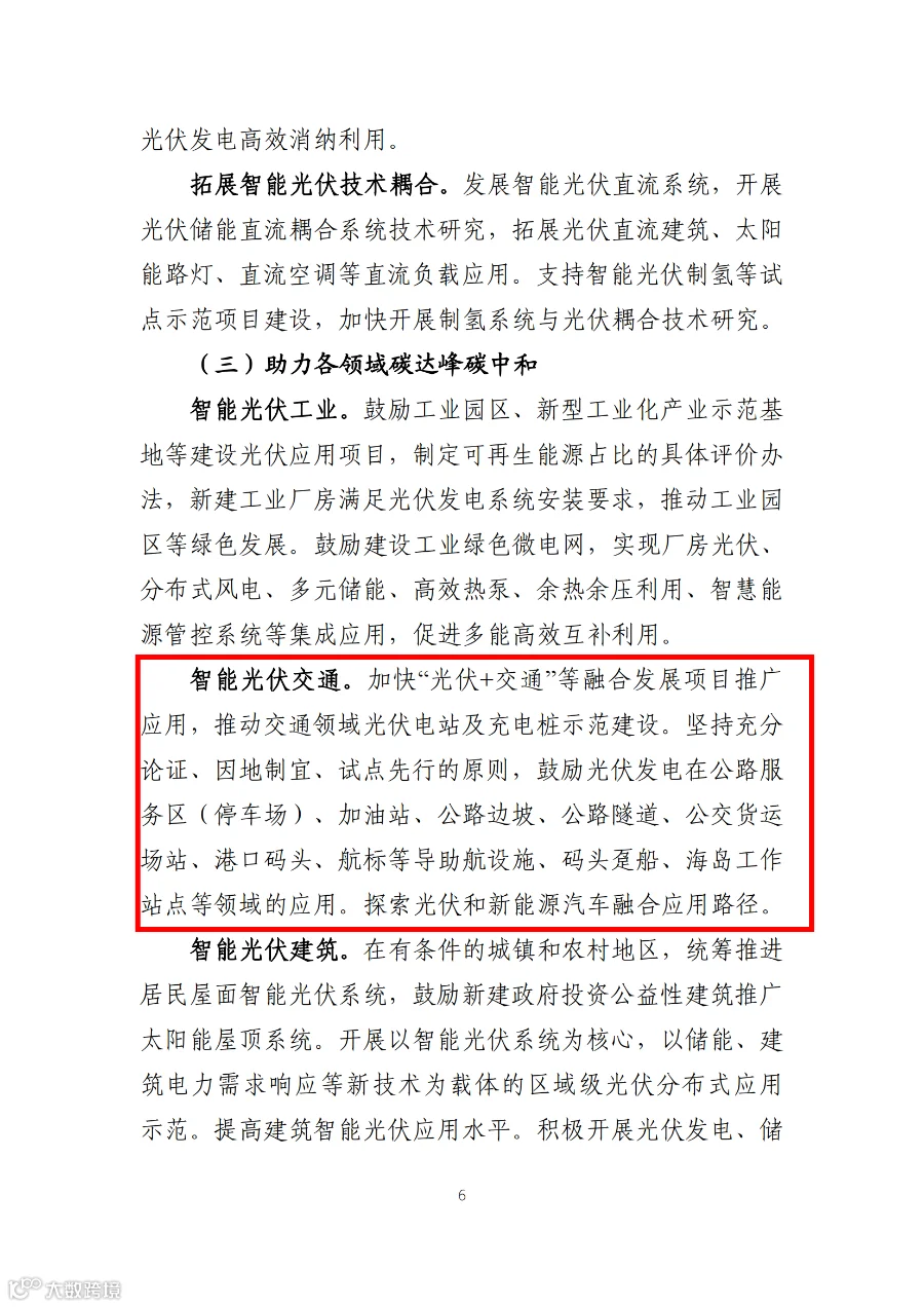 其中,在智能光伏交通部分,内容明确加快“光伏+交通”等融合发展项目推广应用,推动交通领域光伏电站及充电桩示范建设。