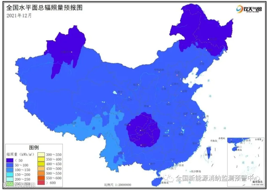 风能方面,三季度全国各地风况变化不大。10月和11月,全国各地风况较为接近。12月平均风速呈减小趋势,风速高值区域较前两月有所减少,风速低值区域较前两月有所增加。 太阳能方面,进入秋冬季节,全国大部地区水平面总辐照量呈现逐月逐渐减少的趋势。平均水平面总辐照量低值区主要位于四川盆地、东北北部、内蒙古北部、新疆北部等地;高值区主要位于青藏高原区域。与常年同期相比,全国大部地区平均水平面总辐照量接近常年同期或比常年同期偏低。
