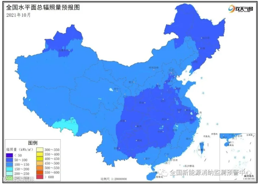 附图2 全国2021年10月水平面总辐照量预报图