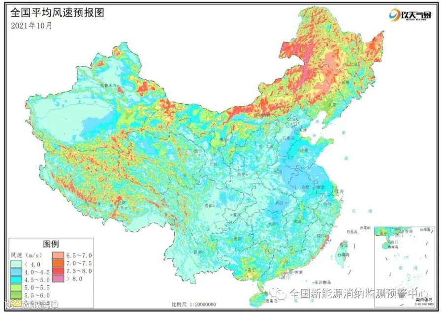 附图1 全国2021年10月平均风速分布预报图