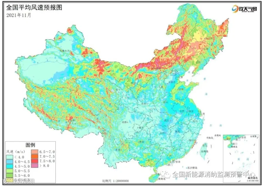 附图3 全国2021年11月平均风速分布预报图