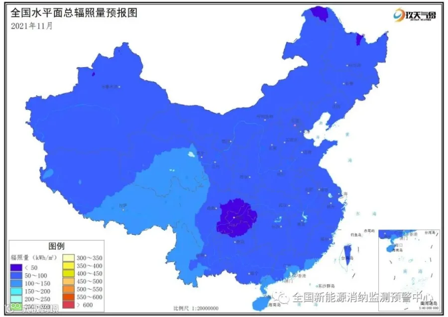 附图4 全国2021年11月水平面总辐照量预报图