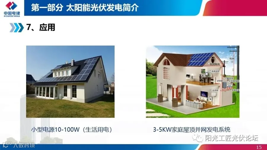 用户太阳能电源:(1)小型电源10-100W不等,用于边远无电地区如高原、海岛、牧区、边防哨所等军民生活用电,如照明、电视、收录机等;(2)3-5KW家庭屋顶并网发电系统;(3)光伏水泵:解决无电地区的深水井饮用、灌溉。