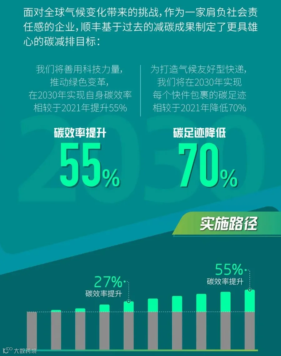 顺丰控股发布了业内首份“碳目标白皮书2021”,提出拟在2021年基础上,在2030年实现自身碳销率提升55%,实现每个快件包裹的碳足迹降低70%。