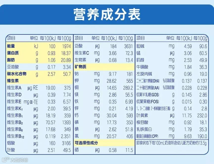 这个问题大家可以在雅士利菁珀 (3段)的营养成分表上窥见一二。表中部分成分被标记了黄色,是不是额外突出呢。这是因为蛋白质、脂肪、碳水化合物、维生素和矿物质是婴幼儿配方奶粉中不可缺少的成分。二十二碳六烯酸(DHA)、二十碳四烯酸(ARA)、牛磺酸、肌醇、胆碱、左旋肉碱、亚油酸、亚麻酸等则为可添加成分。