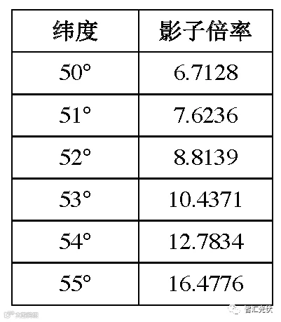 若某地的纬度为35.7°根据表3,纬度为35°、36°时的影子倍率分别为2.3028、2.4174,利用插值法计算35.7°时的影子倍率分别2.383.