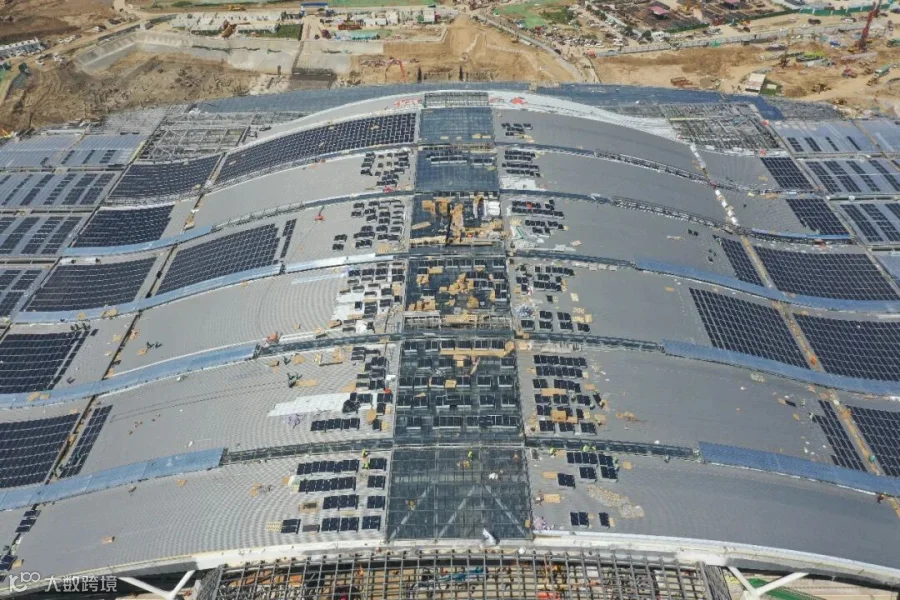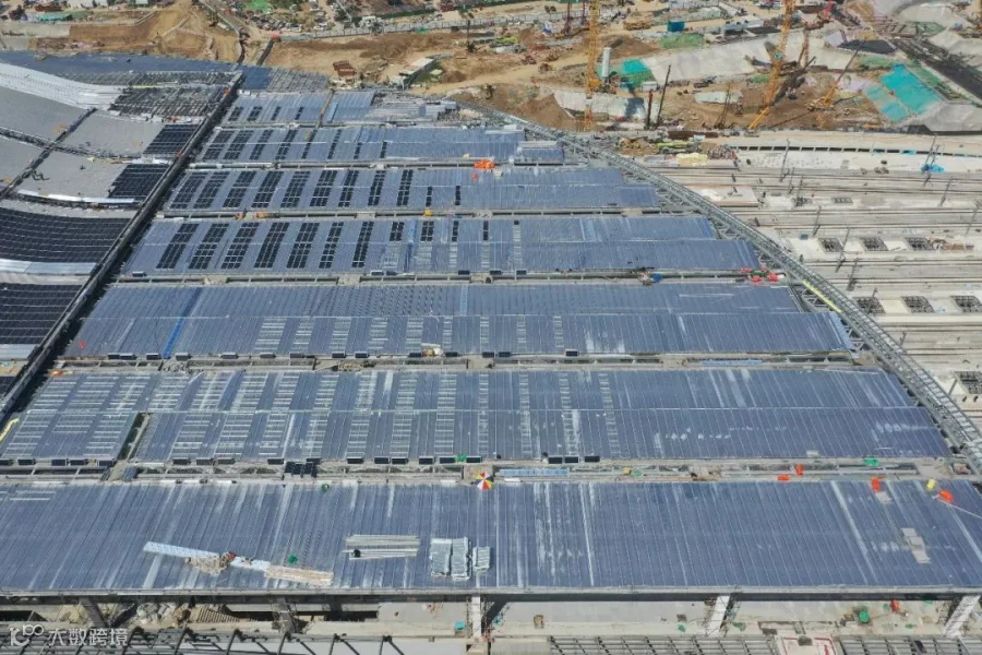很多人不知道的是:在这个亚洲最大的高铁站上,还建设了一个光伏电站。这个屋顶光伏发电项目在站房屋顶两侧,铺设了1.77万块、4.2万平方米光伏组件,从高处俯瞰,犹如“水滴上的一颗明珠闪闪发光”,与屋顶造型相辅相成。