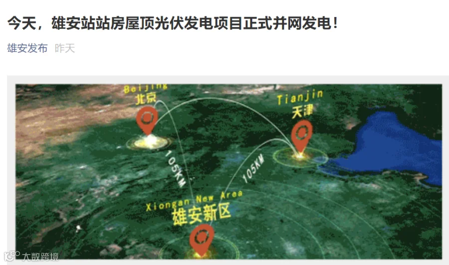 12月25日,雄安管委会官方公众号【雄安发布】发表文章:《今天,雄安站站房屋顶光伏发电项目正式并网发电!》,标志着这个光伏发电项目开始正式投入使用,为雄安高铁站持续提供清洁电力。