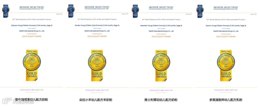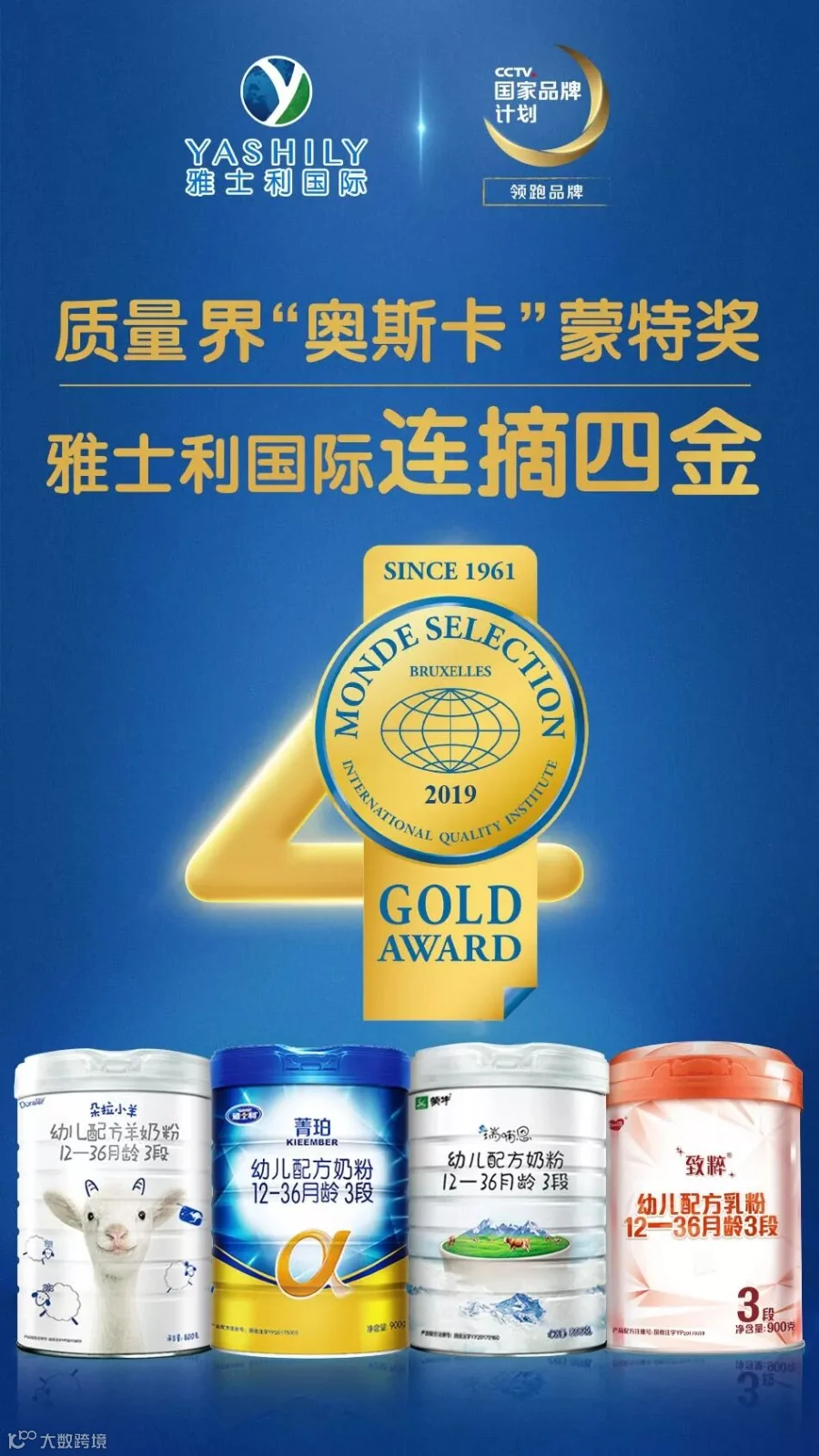 2019年4月5日,雅士利国际收到来自世界食品品质评鉴大会邀请函及金奖贺信。信中提及雅士利国际旗下四大产品,包括雅士利菁珀幼儿配方奶粉、蒙牛瑞哺恩幼儿配方奶粉、多美滋致粹幼儿配方乳粉、朵拉小羊幼儿配方羊奶粉一举荣获本届“世界食品品质评鉴大会”国际高质量金奖。