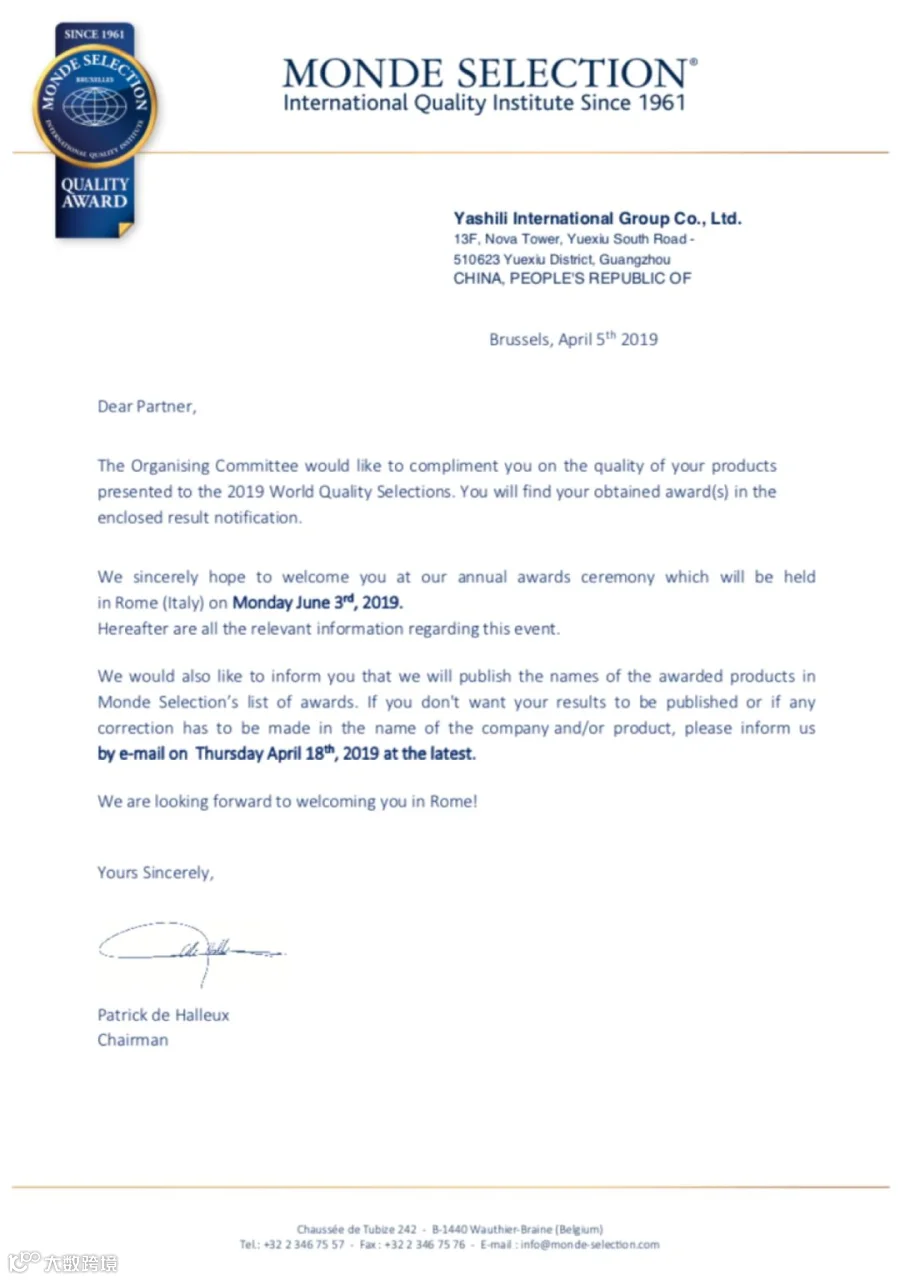 品质和荣誉的双项认证,是世界食品品质评鉴大会对雅士利国际的高度认可。2019年6月3日,雅士利国际邀您在意大利罗马 ,一同见证荣耀时刻!