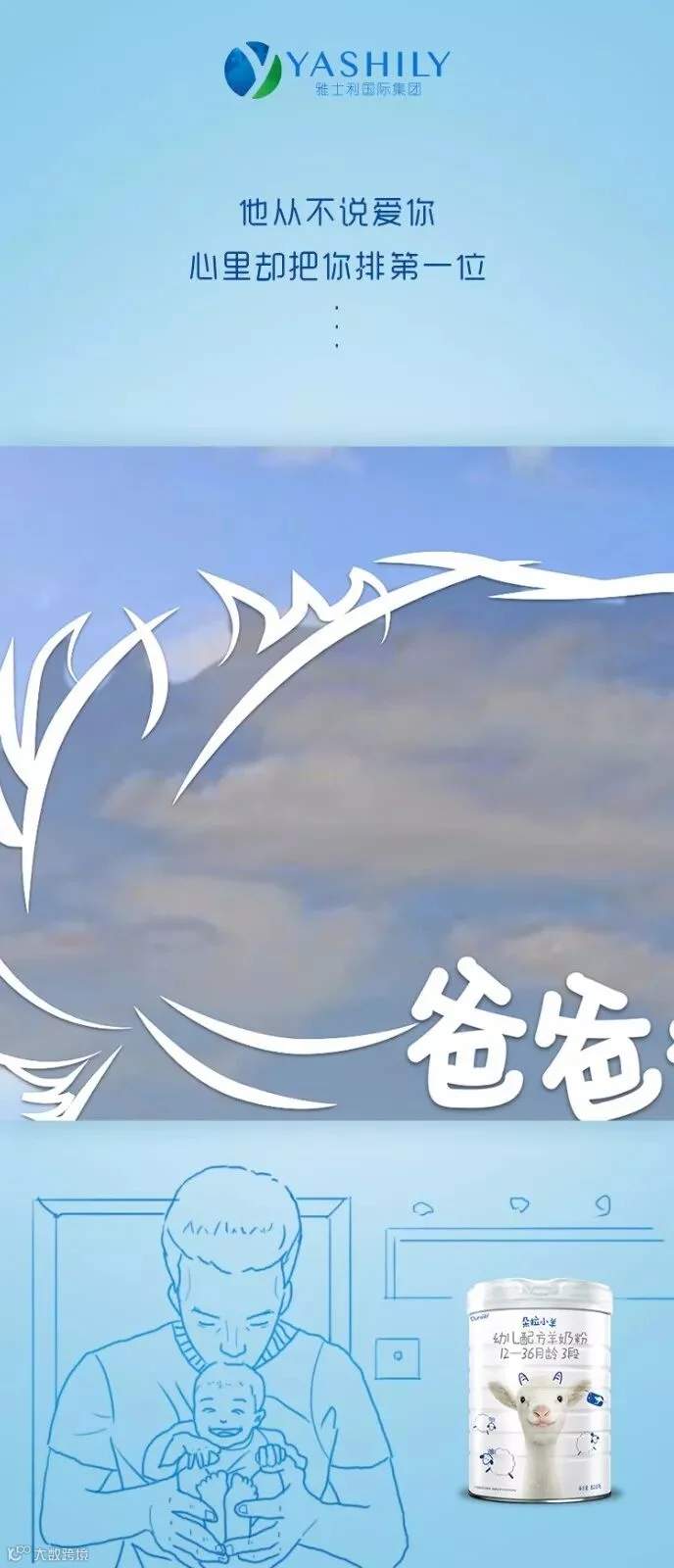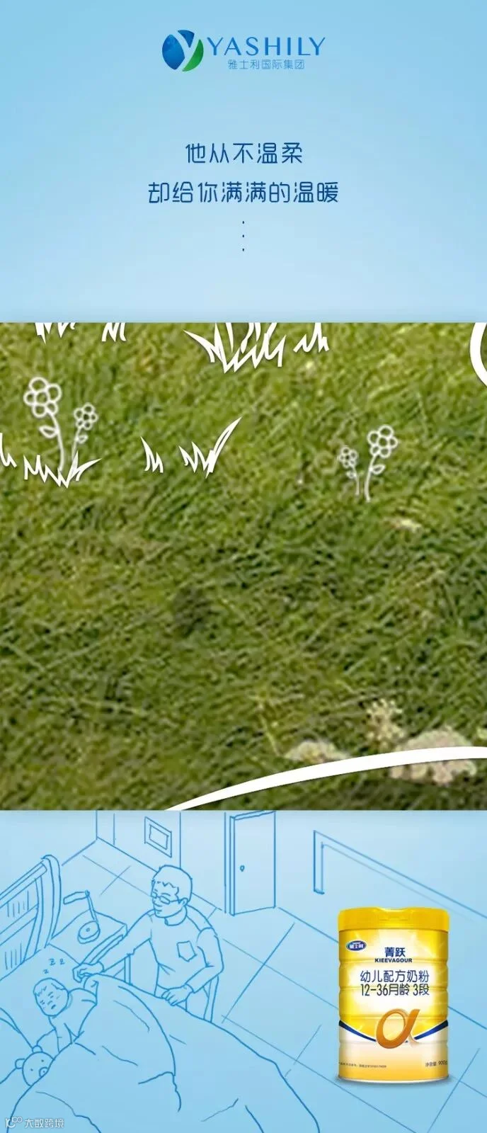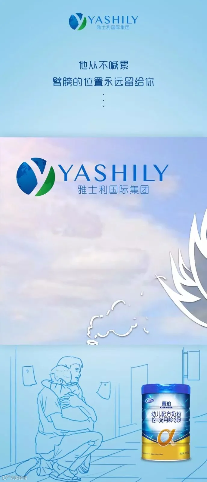 从手忙脚乱帮孩子换尿布、喂奶,到工作间隙也要争分夺秒视频,再到现在轻轻松松hold住娃,从带娃小白到超强奶爸。雅士利与万千奶爸一起见证宝宝成长的每一步,汇你所想为你所爱。在宝宝生命最柔软的时刻,给Ta百分百的安全保护,以一种温暖、细致、安全的保护,让宝宝拥有独立面对未来的力量,成为自己的英雄。