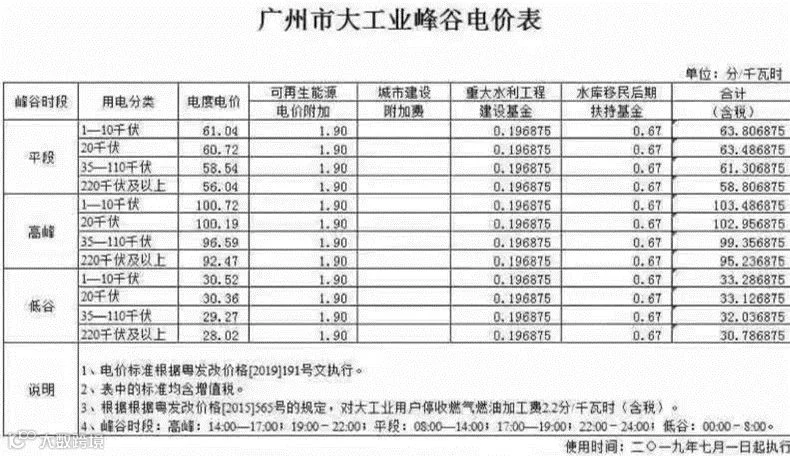 以广州1MW的光伏电站为例,单瓦造价是4.5元/瓦(注:有些地区市场价格更低),总造价就是450万元,每年分摊成本为18万(光伏电站设计寿命为25年)。1MW的光伏电站年平均发电量约110万千瓦时,广州的大工业加权平均电价为0.835元/千瓦时(具体峰平电价与时间段请看下表),上网电价为0.453元/千瓦时。