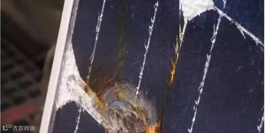 为了防止太阳电池由于热斑效应而遭受破坏,最好在太阳电池组件的正负极间并联一个旁路二极管,以避免光照组件所产生的能量被受遮蔽的组件所消耗。当热斑效应严重时,旁路二极管可能会被击穿,令组件烧毁,如下图(图片来自于TUV-Rheinland)。