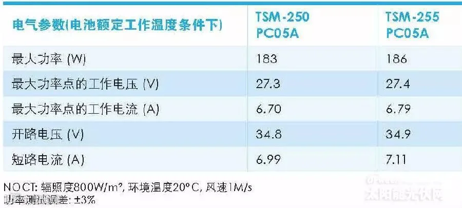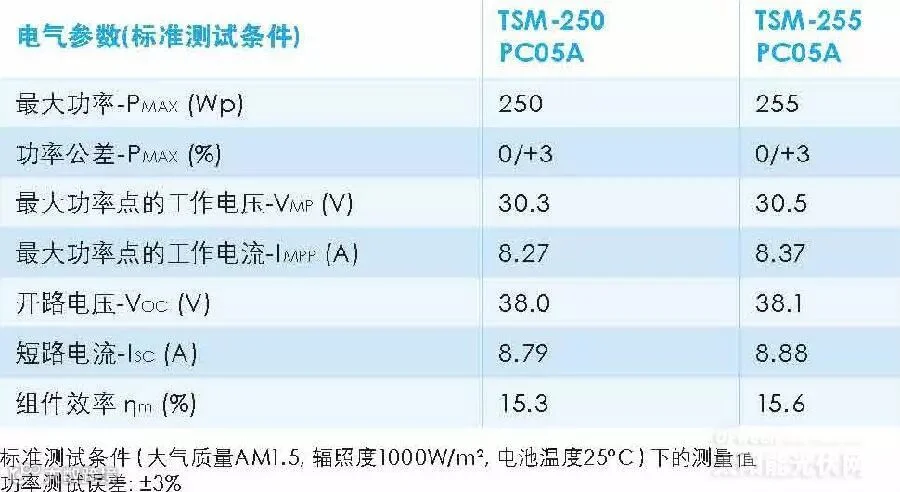 我们常说,采用255Wp光伏组件。下表的“p”为peak的缩写,代表其峰值功率为255W。所有的技术规格书中都会标注“标准测试条件”的。下图为常州天合的光伏组件技术规格书一部分(250W,下同)。