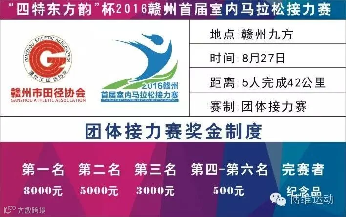 1、室内马拉松接力赛是通过五名选手共同在跑步机上完成42.195公里,赣州首届室内马拉松接力赛是由四名男选手每人完成9公里,一名女选手完成6公里,通过五名选手的共同努力,在短的时间完成比赛获得胜利。