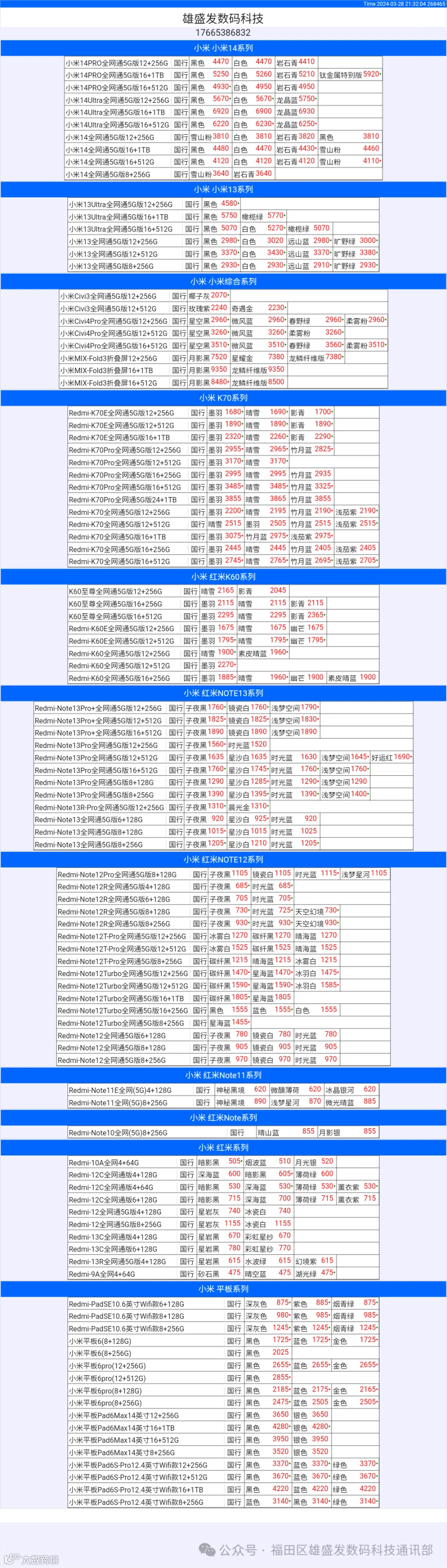 新机报价【2024年3月28日】小米  红米   黑鲨   报价 芯烨微 电子科技