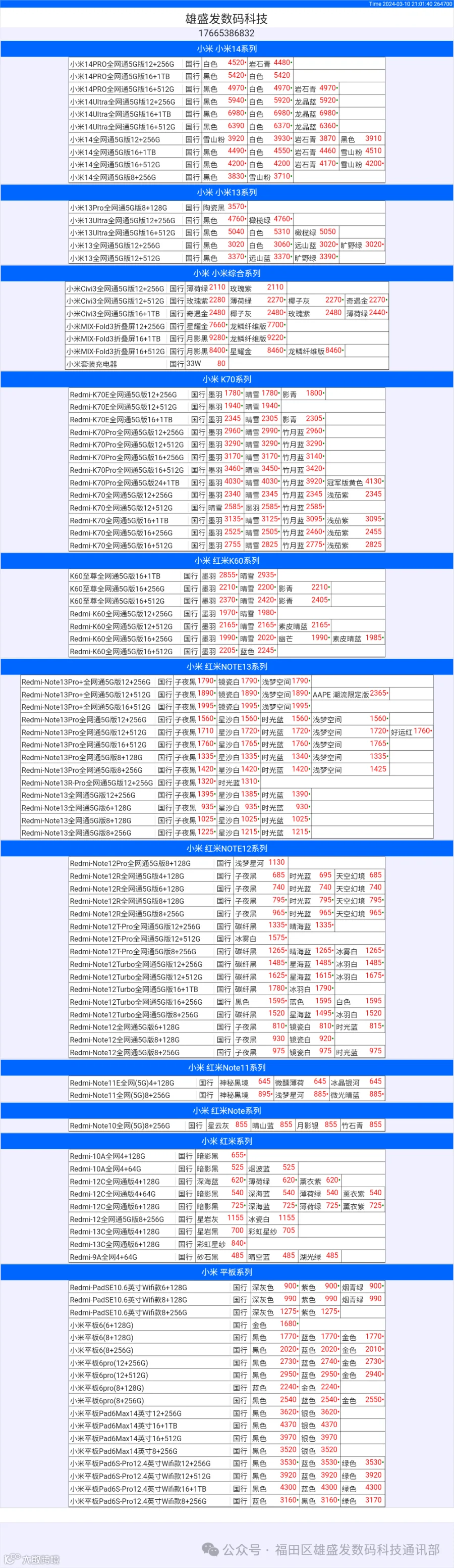 新机报价【2024年3月10日】小米  红米   黑鲨   报价 芯烨微 电子科技