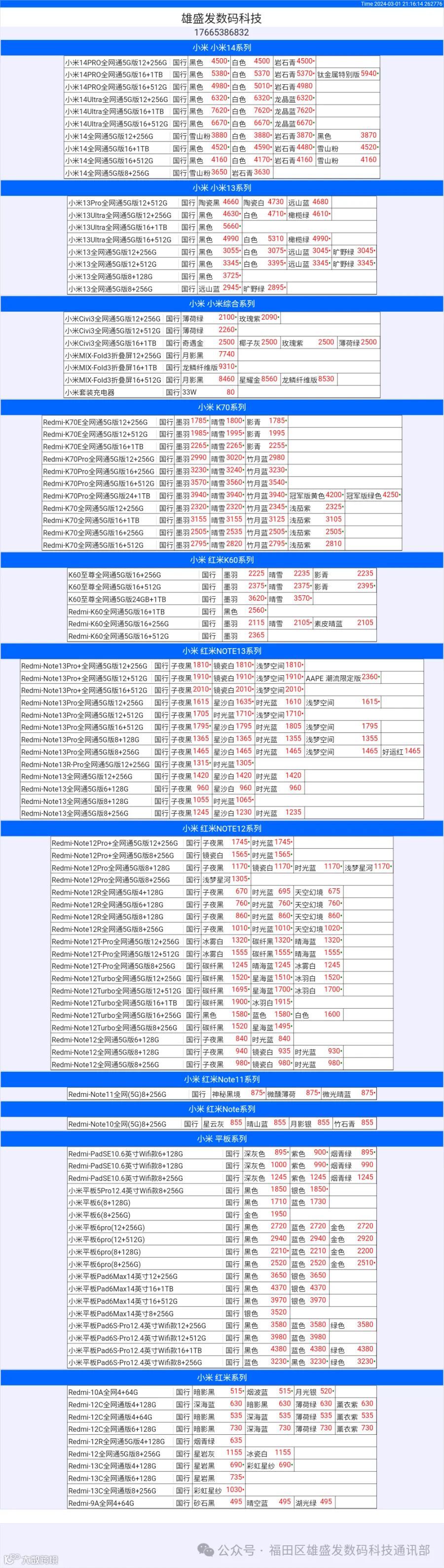 新机报价【2024年3月1日】小米  红米   黑鲨   报价 芯烨微 电子科技