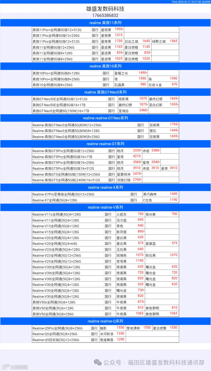 新机报价【2024年2月27日】OPPO VIVO IQOO 一加 真我