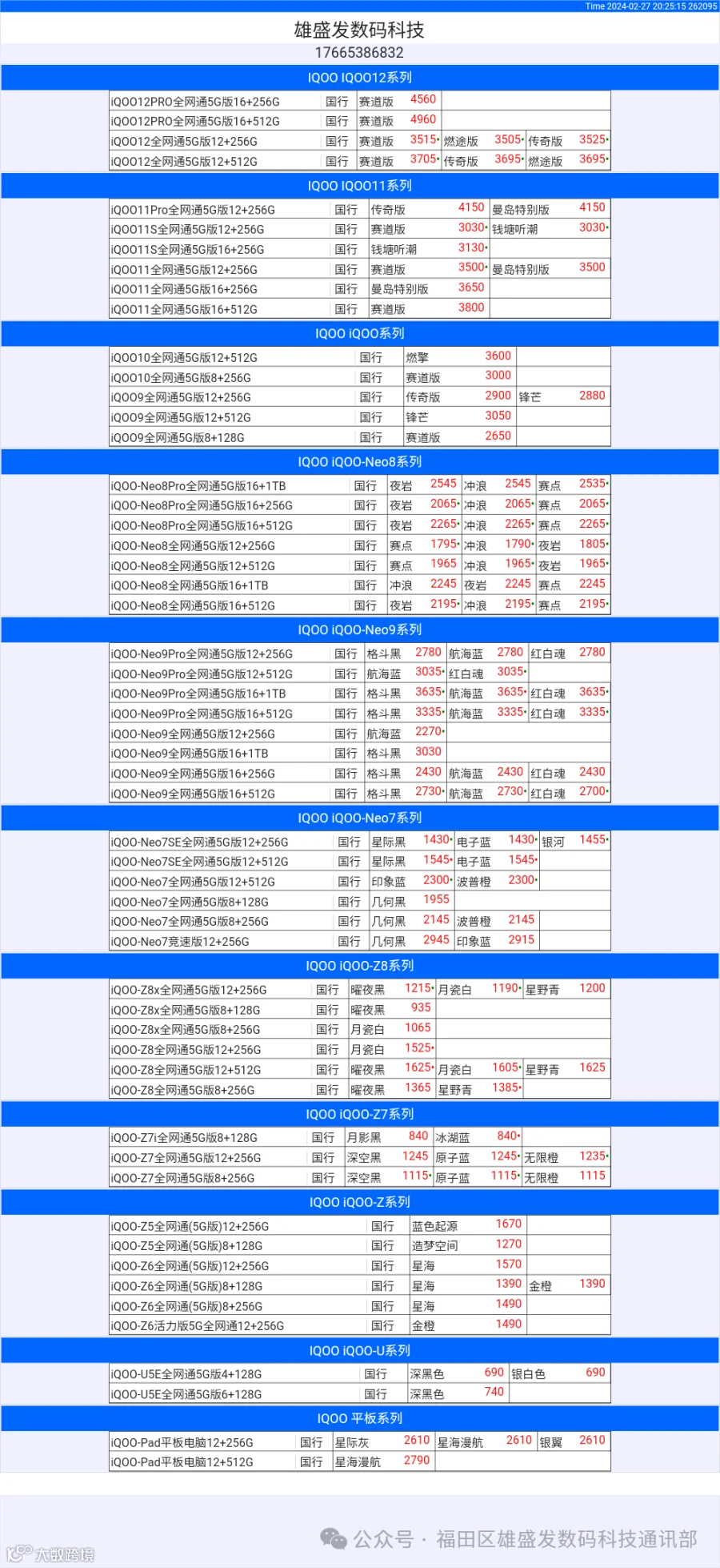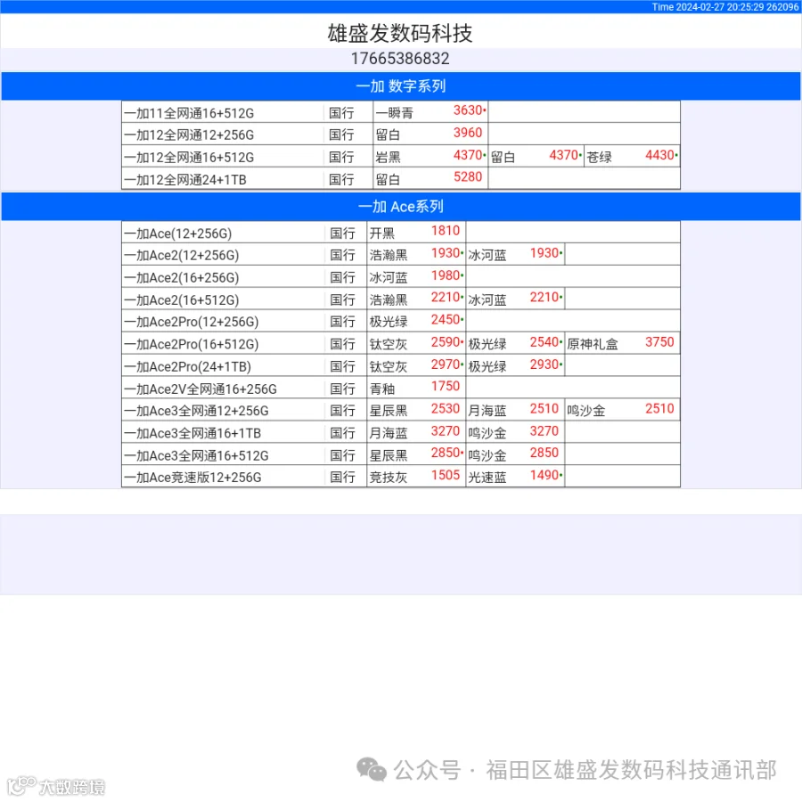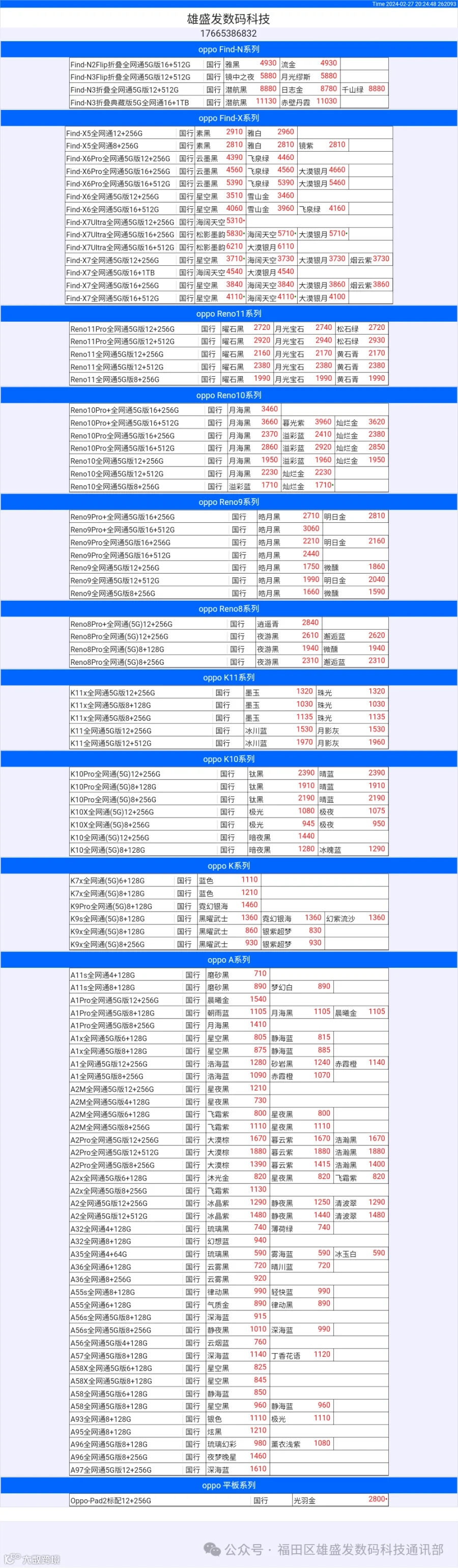 新机报价【2024年2月27日】OPPO   VIVO  IQOO   一加   真我 芯烨微 电子科技