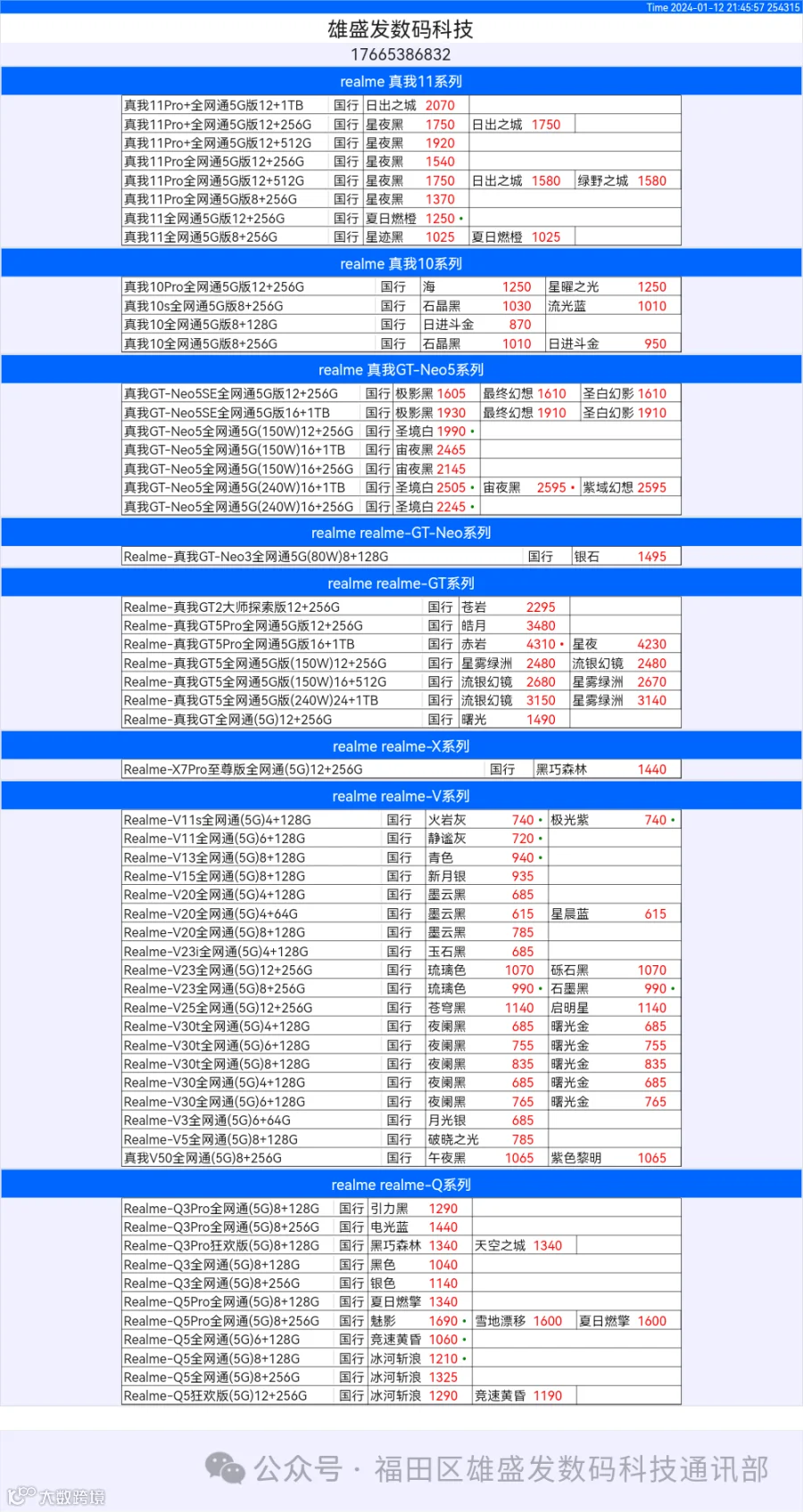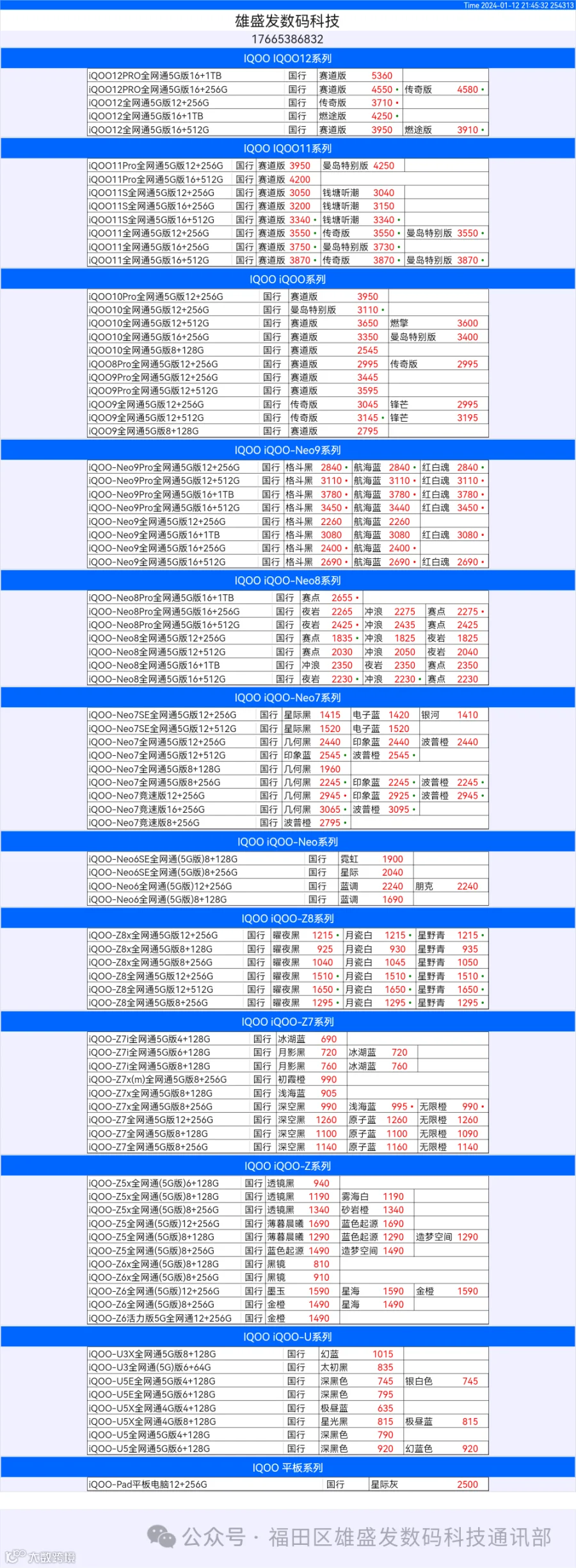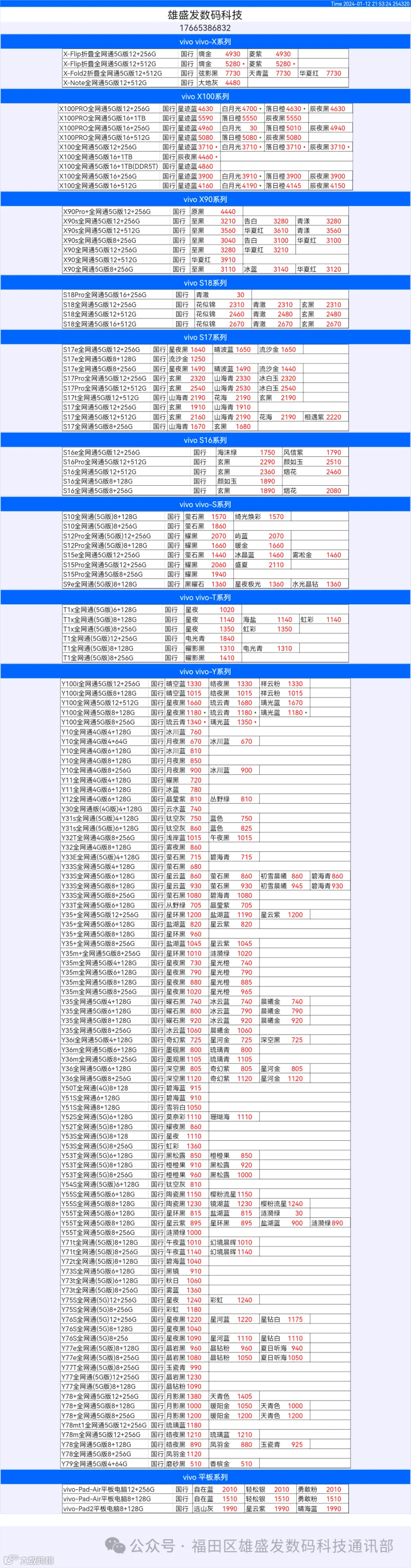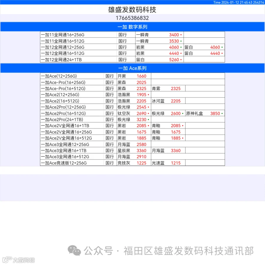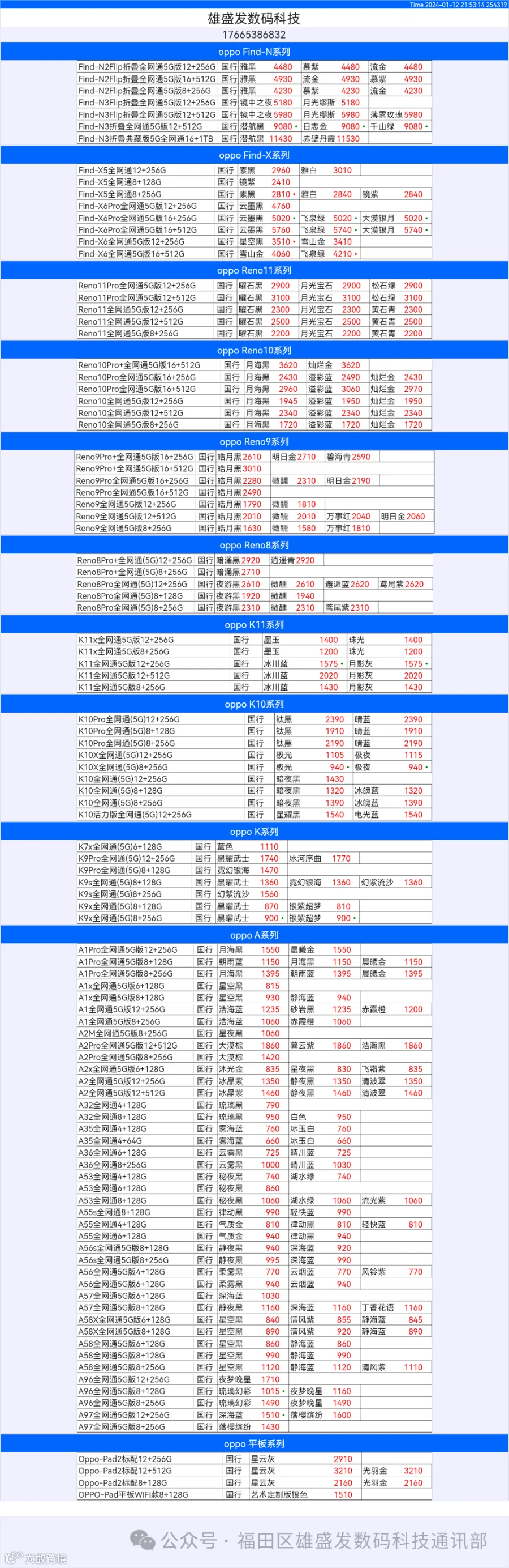 新机报价【2024年1月12日】OPPO   VIVO  IQOO   一加   真我 芯烨微 电子科技
