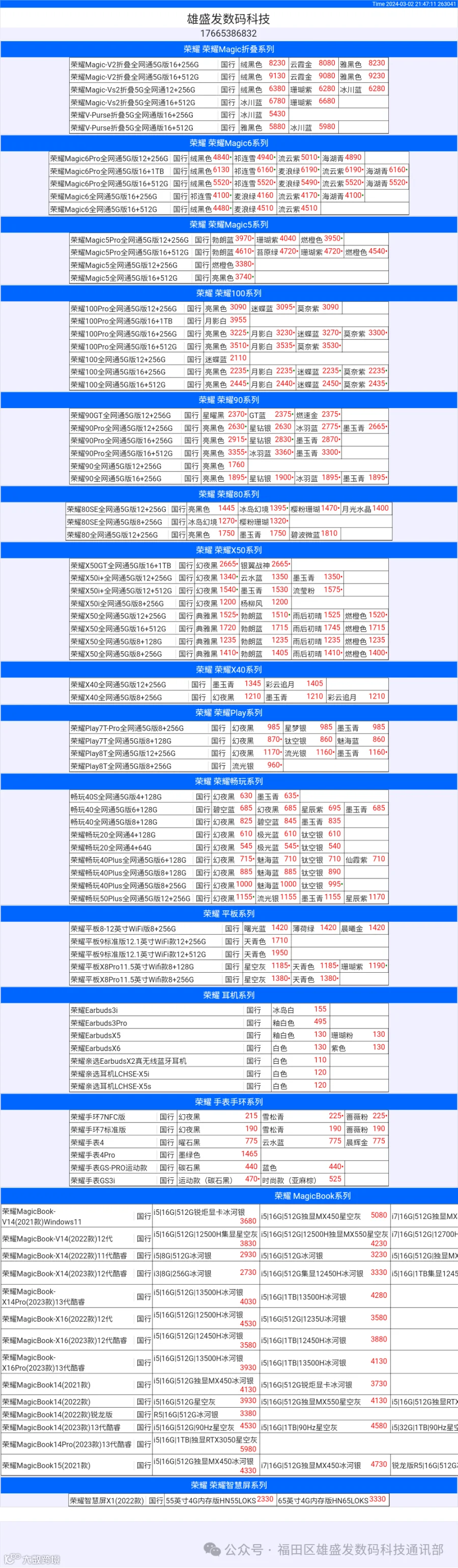 新机报价【2024年3月2日】华为   荣耀 报价 芯烨微 电子科技