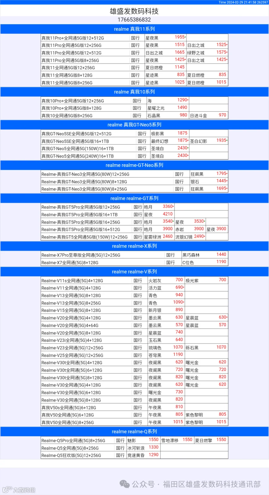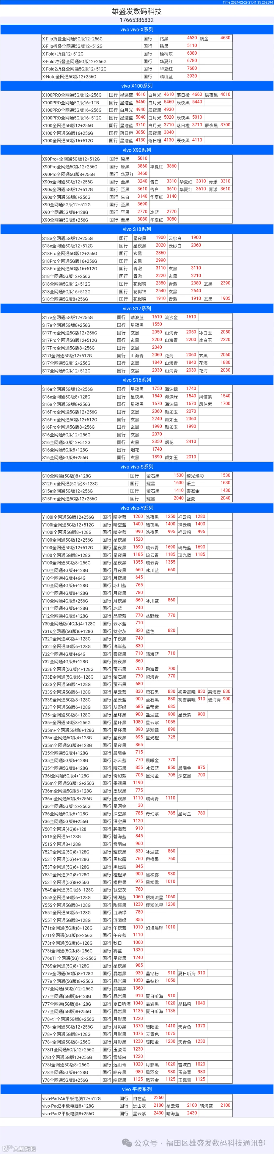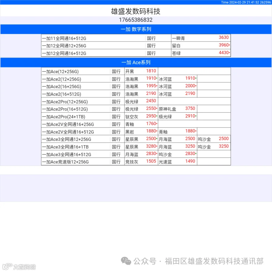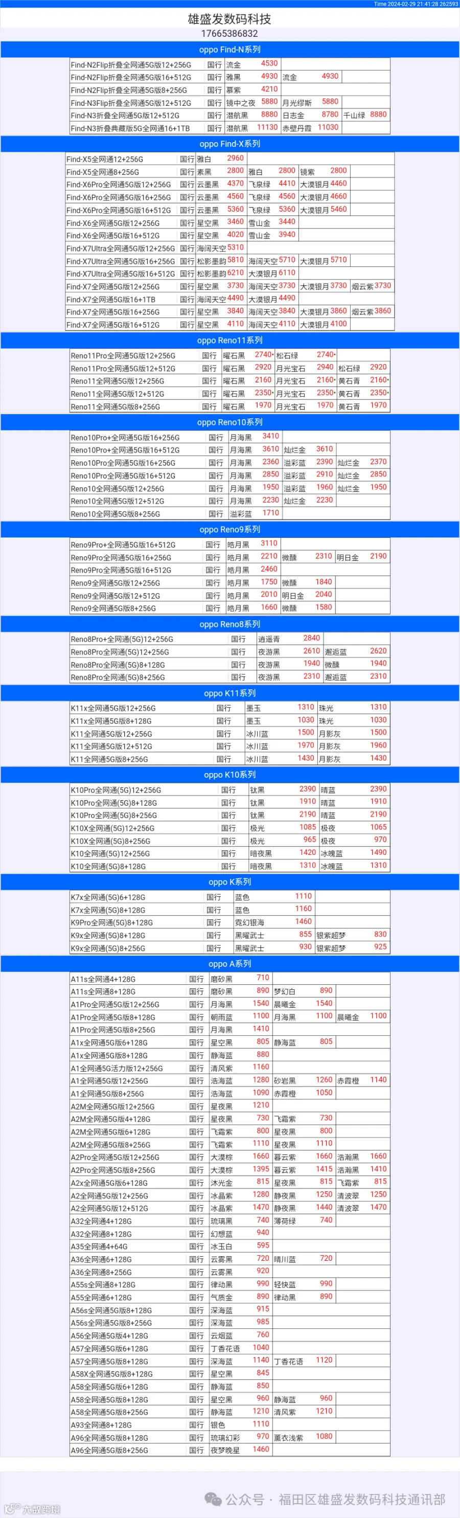新机报价【2024年2月29日】OPPO   VIVO  IQOO   一加   真我 芯烨微 电子科技