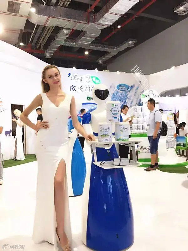 蒙牛瑞哺恩展区的酷炫智能机器人小队与歪果长腿小姐姐一起招待到场来宾!